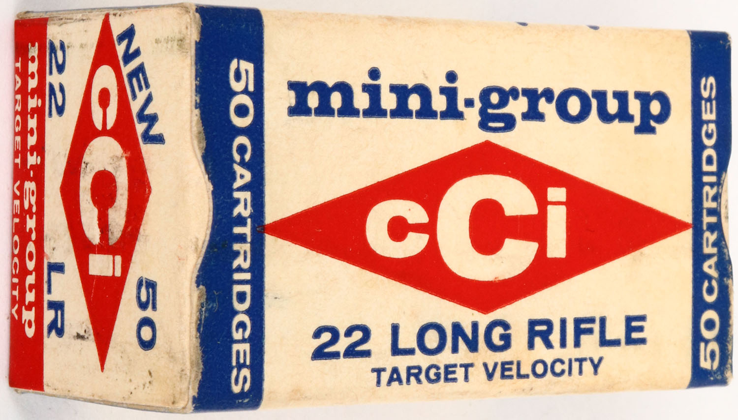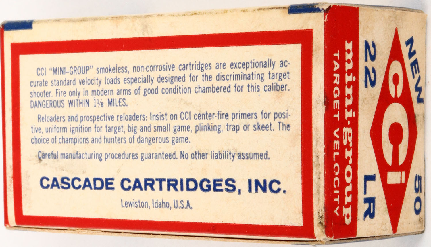 CCi, mini-group, .22 Long Rifle, RHWeb: CCI-1 LR-10, Full, 1pc. White blue & red box, box is solid with excellent color, only very minor age soiling & shelf wear, corners are mostly sharp, edges are crisp, end flaps are rigid, ammo is excellent. Grade: Excellent ++ - Value: 6 to 30