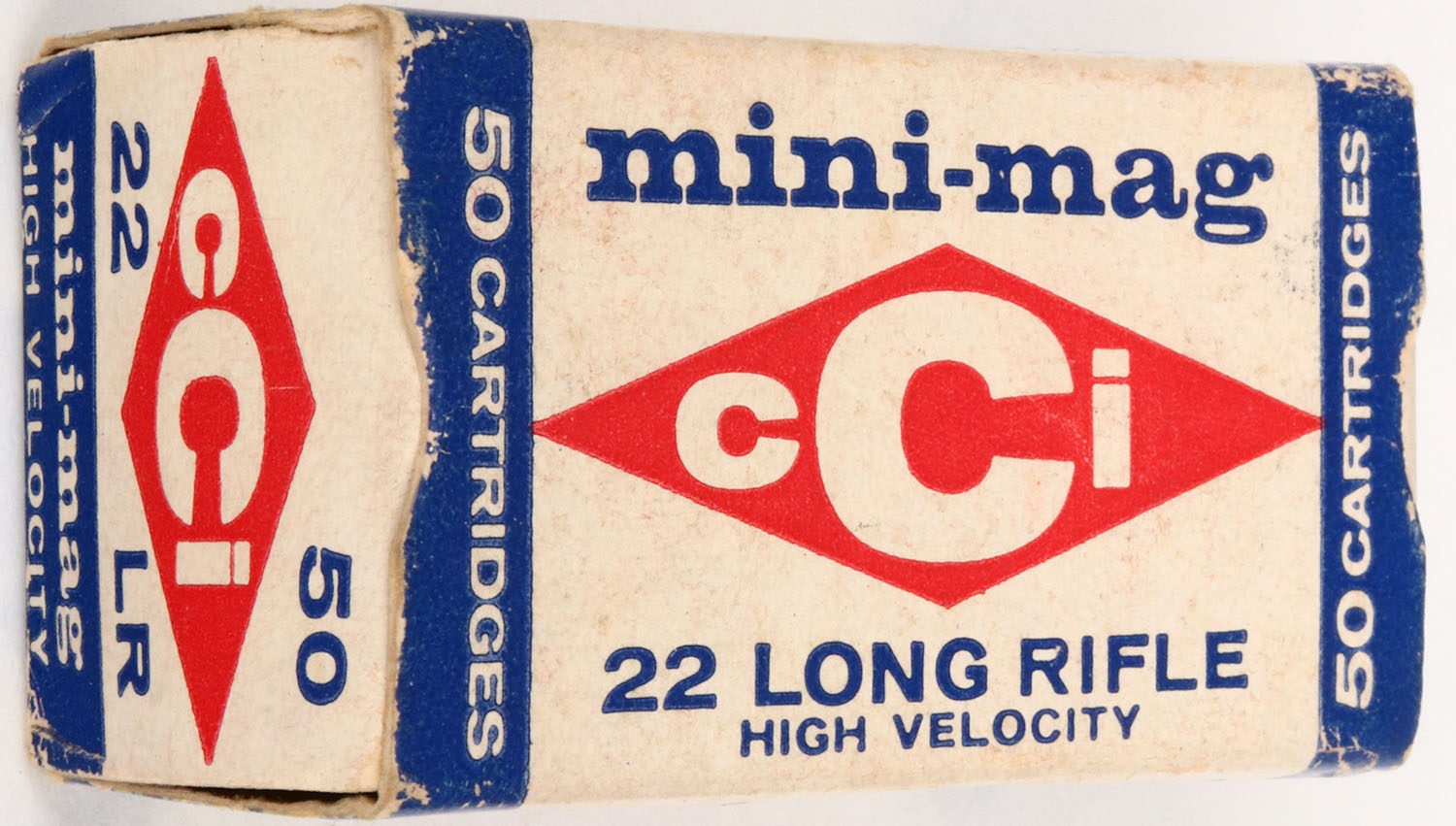 CCi, mini-mag, .22 Long Rifle, High Velocity, RHWeb: CCI-2 LR-1e, Full, 1pc. White blue & red box, box is solid with excellent color, minor age soiling & corner wear, very minor edge wear, end flaps are solid, ammo is excellent. Grade: Excellent + - Value: 4 to 20