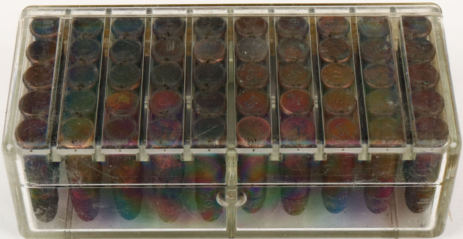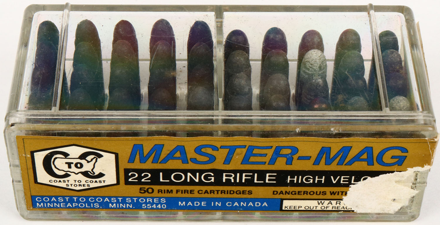 Coast to Coast, Master-Mag, .22 Long Rifle, High Velocity, RHWeb: CTC-2 LR-1.1, Full, 2pc. Clear plastic tray with bronze & blue side sealing labels, box is solid, label is 90% intact with minty color, ammo is very good. Grade: Excellent - Value: 10 to 50
