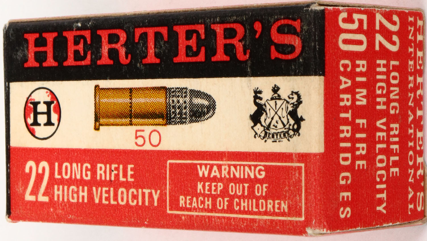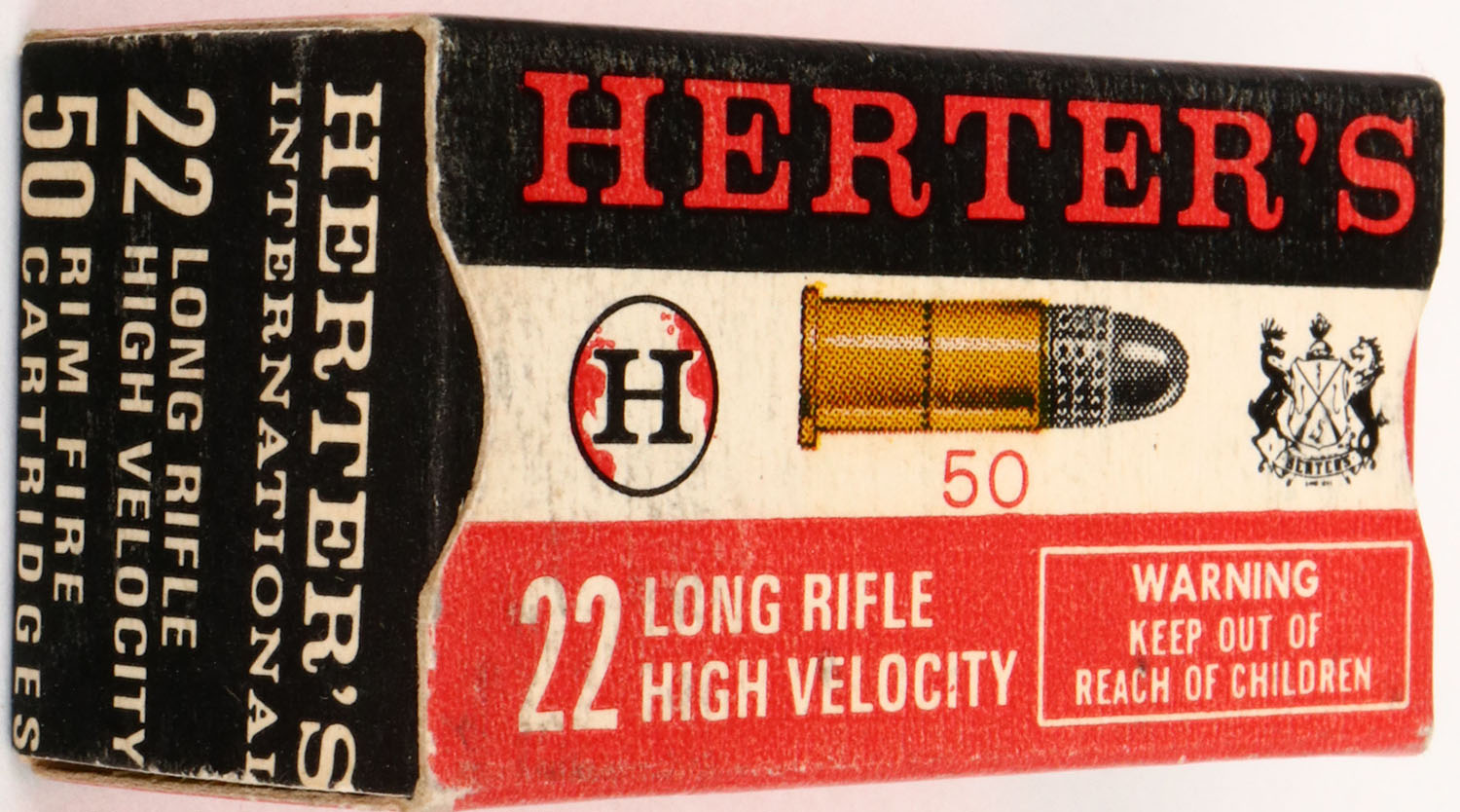 Herter's, .22 Long Rifle, High Velocity, RHWeb: HERT-1 LR-1a, Full, 1pc. Red black & white box, box is near mint with excellent color, only very minor age soiling & corner wear, edges are crisp, end flaps are rigid, ammo is excellent to minty. Grade: Excellent ++ - Value: 8 to 40