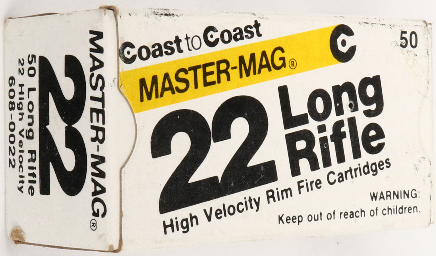 Coast to Coast, Master-Mag, .22 Long Rifle, High Velocity, RHWeb: CTC-1 LR-3, Full, 1pc. White & black box, box is solid with excellent color, very minor age soiling & corner wear, edges are mostly crisp, end flaps are solid, ammo is minty. Grade: Excellent + - Value: 4 to 20