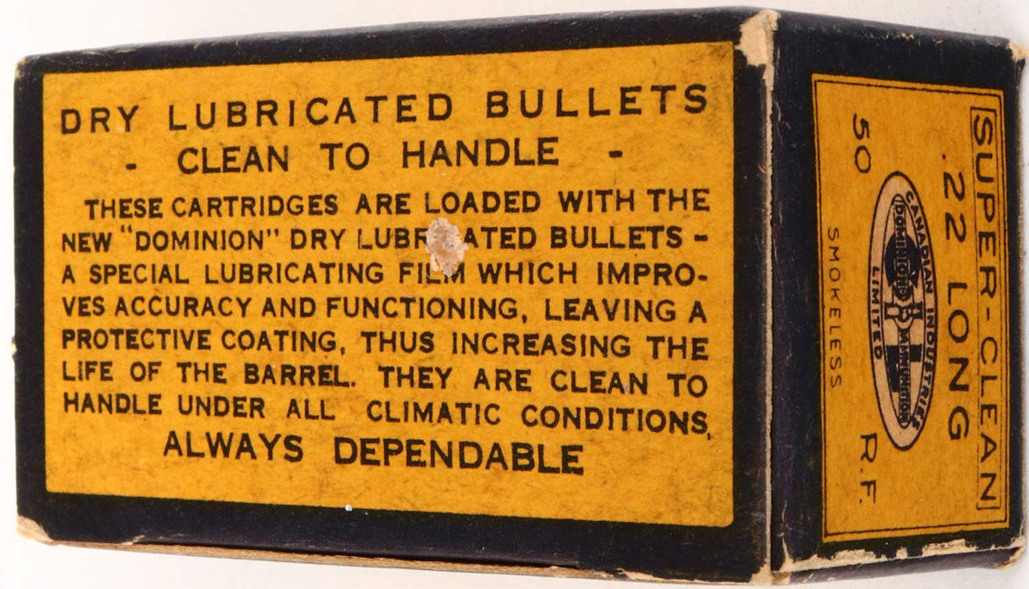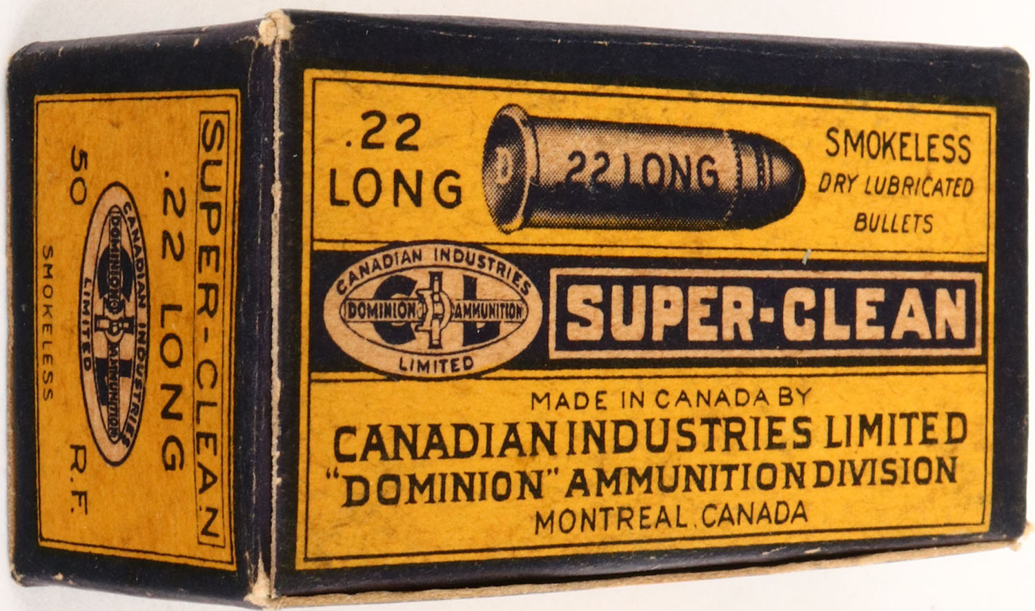 C.I.L., Super-Clean, .22 Long, RHWeb: CIL-2 L-2, Full, 1pc. Yellow & blue box, box is solid with excellent color, very minor age soiling & corner wear, edges are crisp, top flap is solid, ammo is excellent. Grade: Excellent ++ - Value: 6 to 30