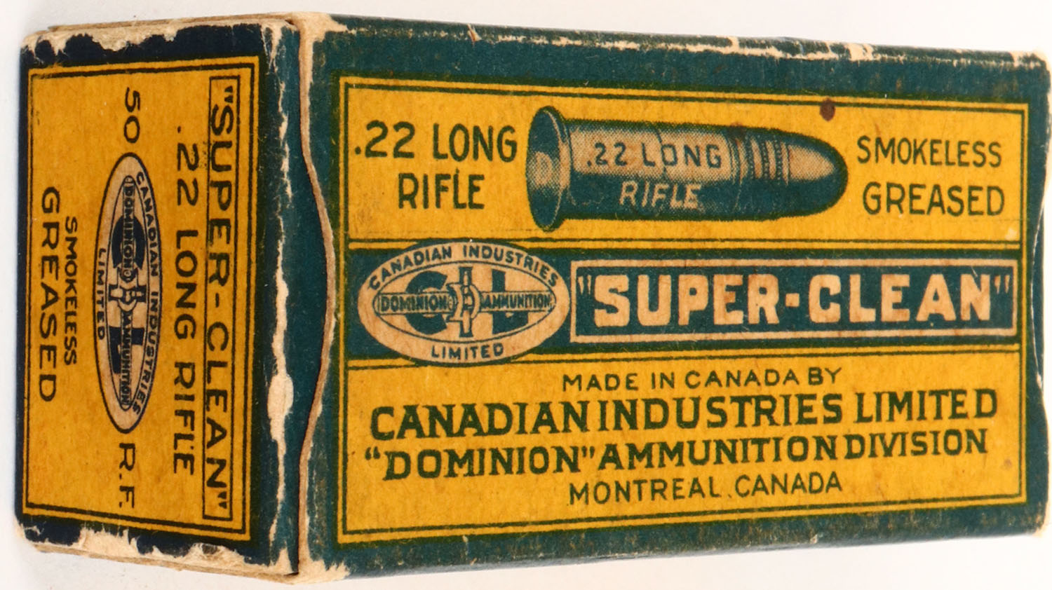 C.I.L., Super-Clean, .22 Long Rifle, Smokeless Greased, RHWeb: CIL-2 LR-1c (TT-59 on end flap), Full, 1pc. Yellow & blue box, box is solid with very good color, age soiling, edge & corner wear, end flaps are solid, ammo is very good. Grade: Excellent + - Value: 4 to 20