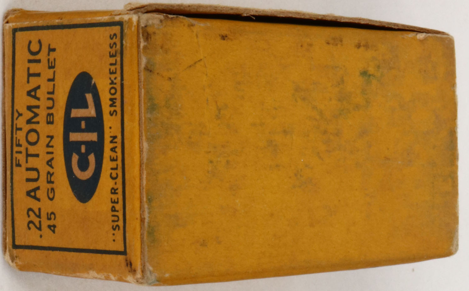 C.I.L., Super-Clean, .22 Automatic, Smokeless Greased, RHWeb: CIL-4 WA-1, Full, 1pc. Buff yellow & blue box, box is solid with excellent color, very minor age soiling & edge wear, corners are mostly sharp, top flap is solid, ammo is minty. Grade: Excellent ++ - Value: 30 to 120
