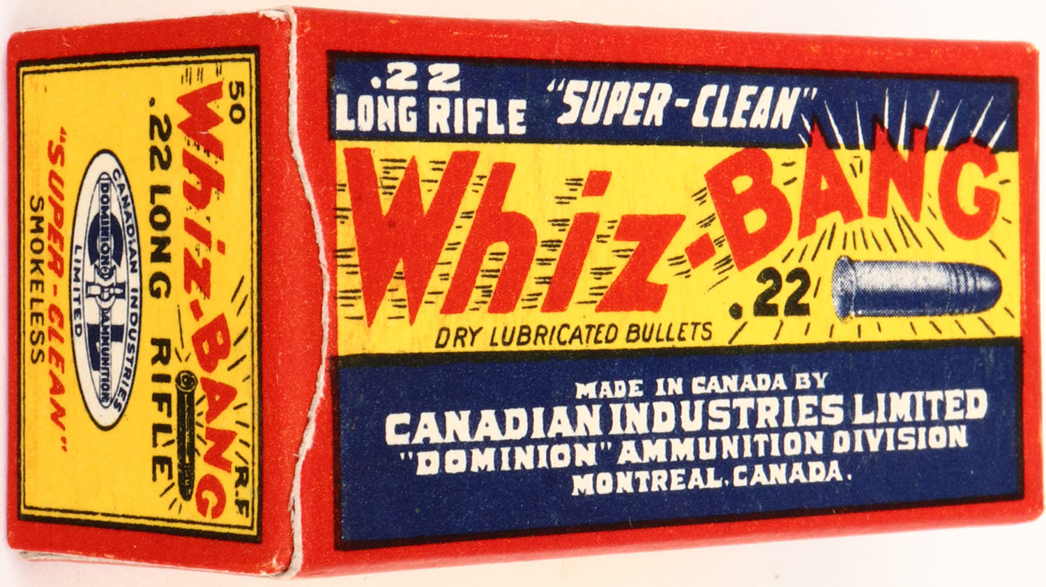 C.I.L., Whiz-Bang, .22 Long Rifle, Super-Clean, RHWeb: CIL-2 LR-6, Full, 1pc. Yellow red & blue box, box is near mint with minty color, only very minor corner wear, edges are crisp, end flaps are solid, ammo is excellent. Grade: MINT - Value: 40 to 120
