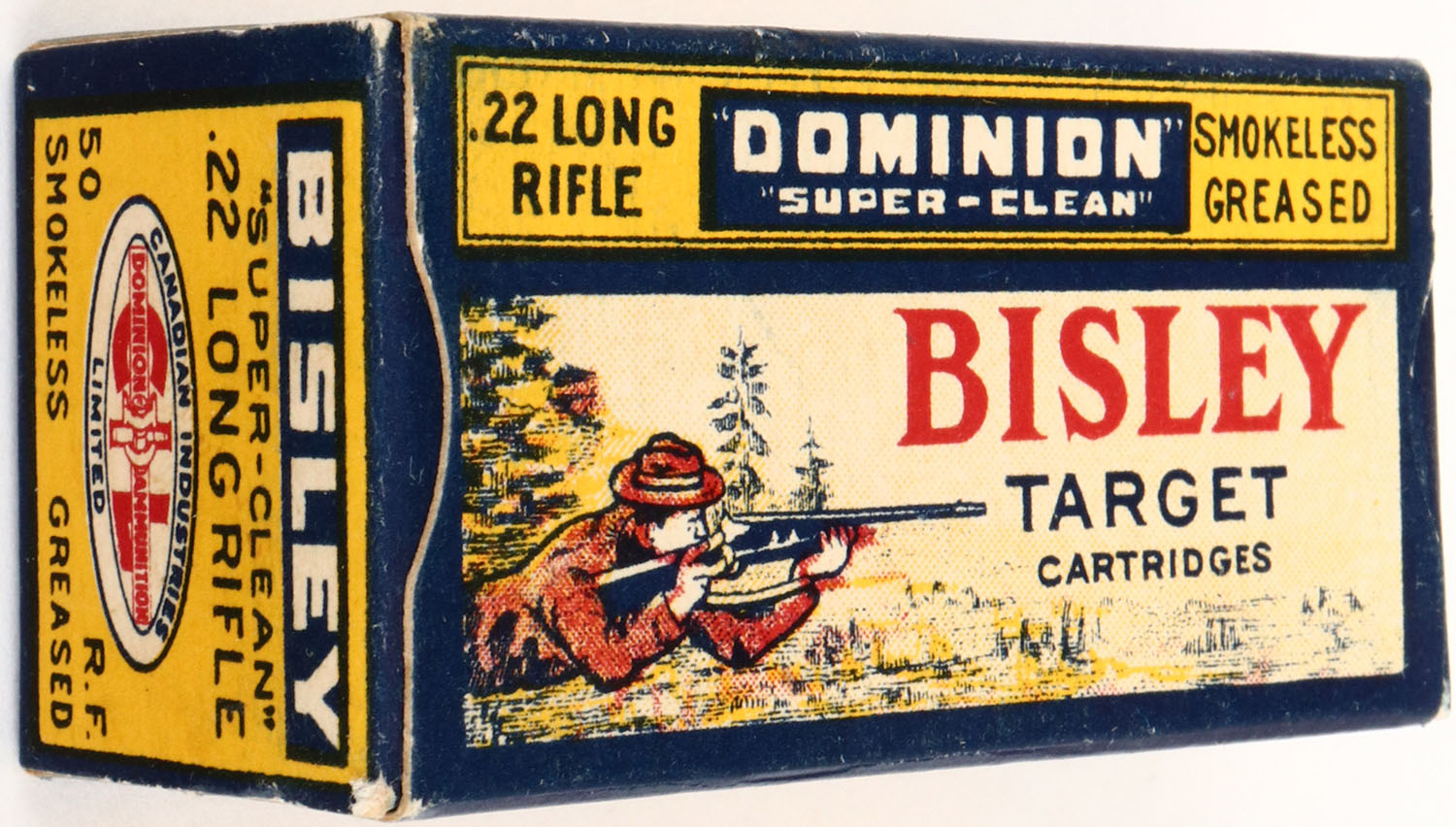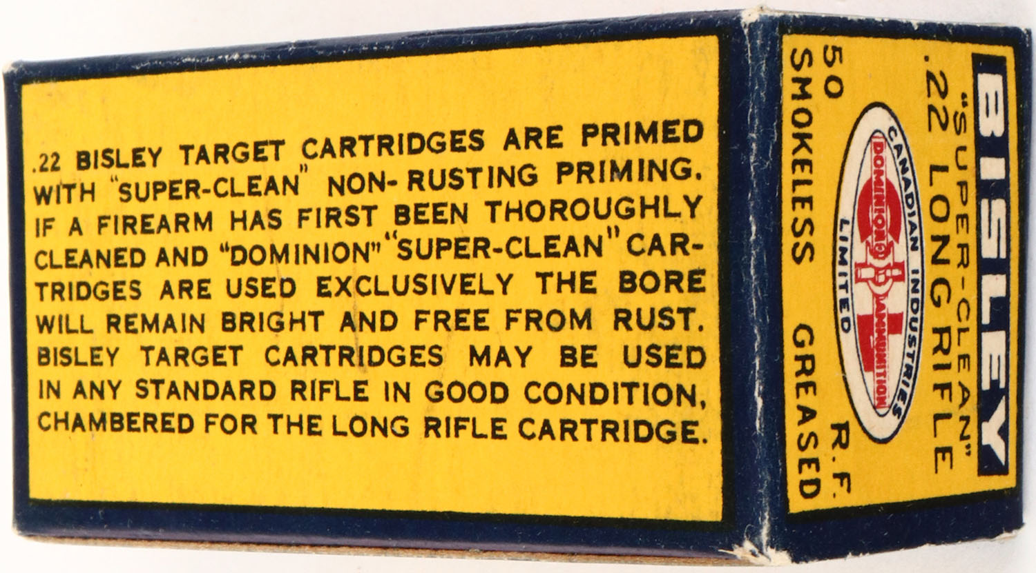 C.I.L., Bisley Target, .22 Long Rifle, RHWeb: CIL-2 LR-15b, Full, 1pc. Multicolored box, box is solid with excellent color, very minor corner wear, edges are crisp, end flaps are solid, ammo is very good. Grade: Excellent ++ - Value: 80 to 240