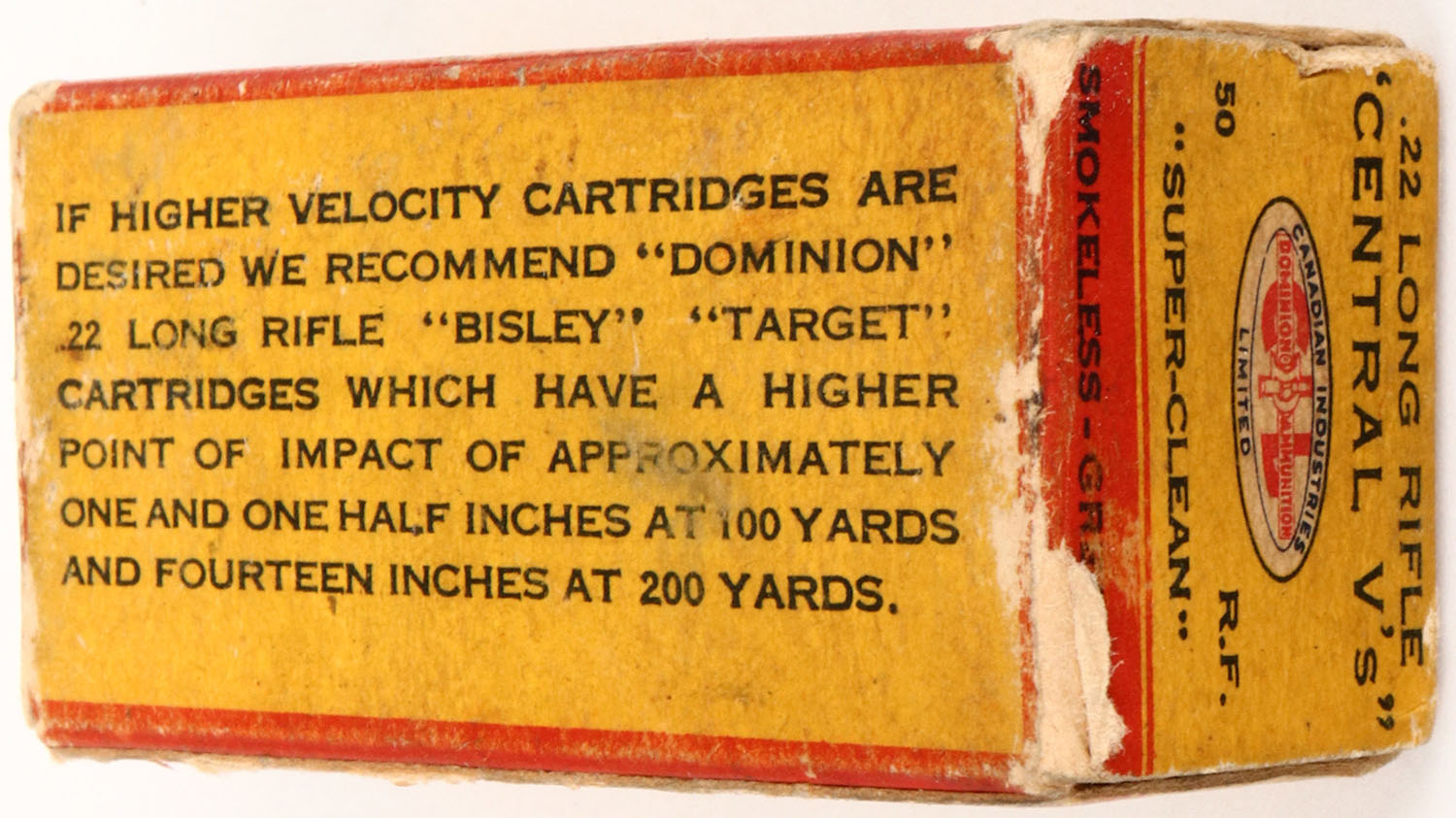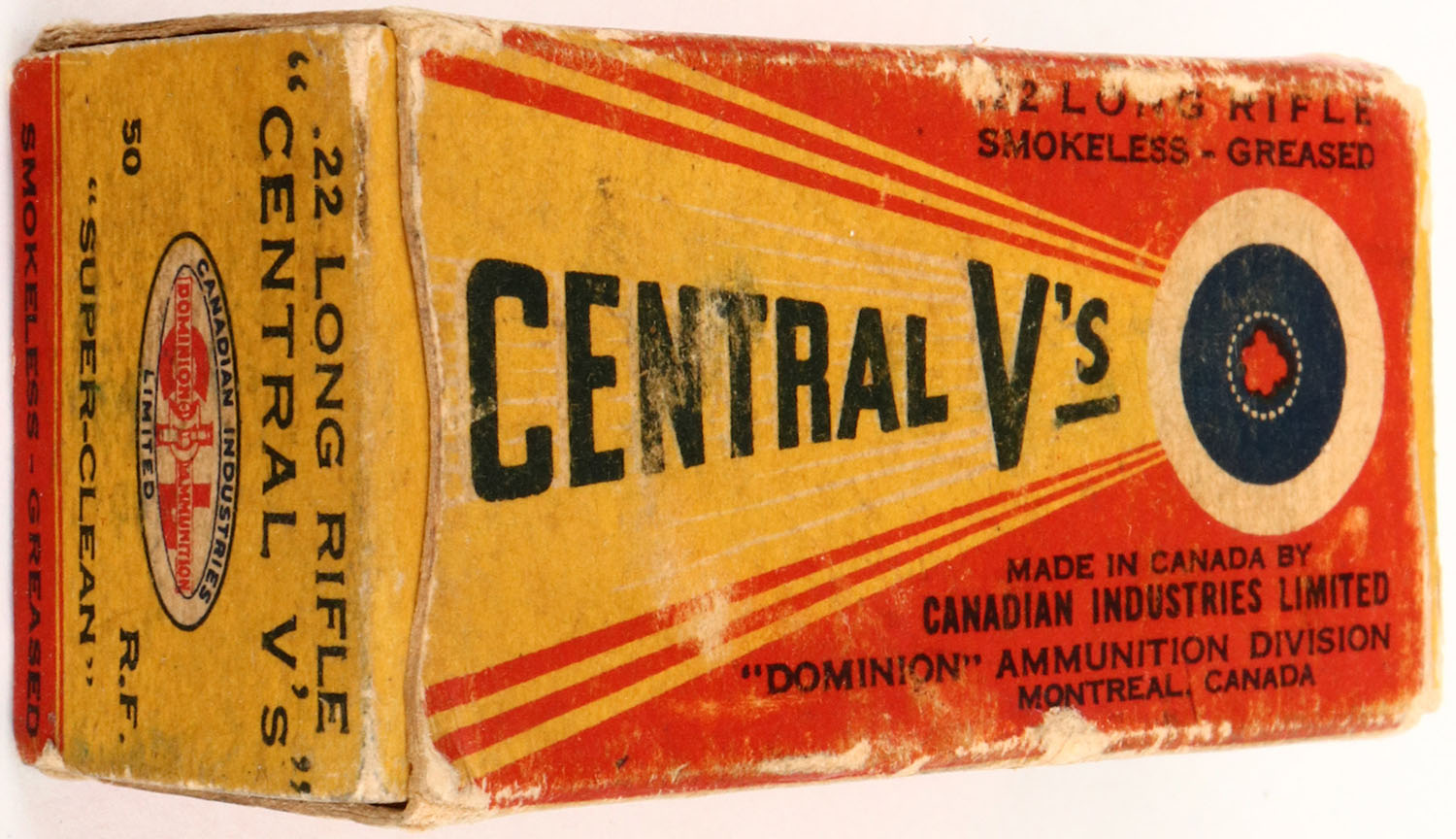 C.I.L., Central V's, .22 Long Rifle, Super-Clean, RHWeb: CIL-2 LR-14, Full, 1pc. Yellow & red box, box is solid with very good to excellent color, age soiling, minor shelf wear, minor edge & corner wear, end flaps are mostly rigid, ammo is very good. Grade: Excellent - Value: 2 to 20