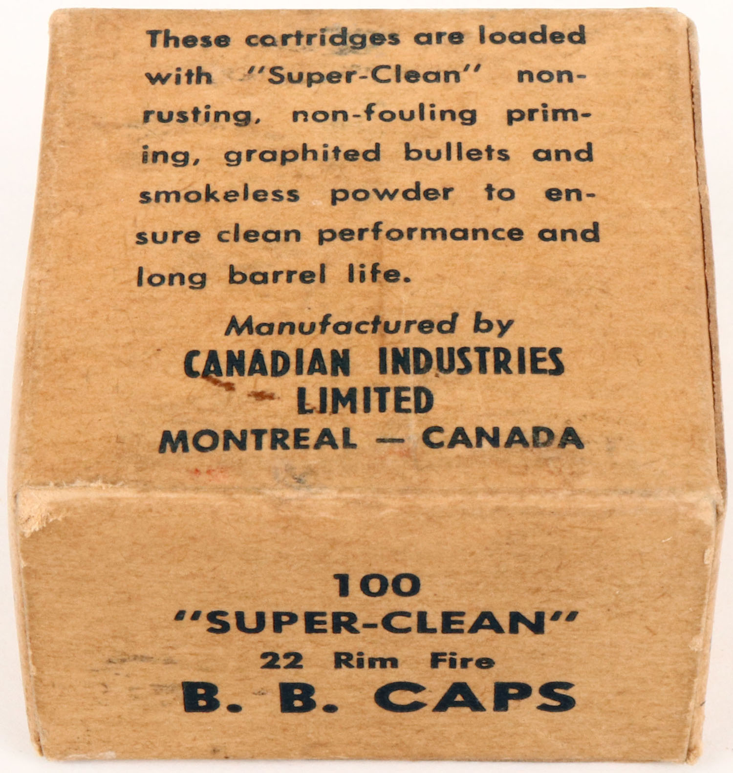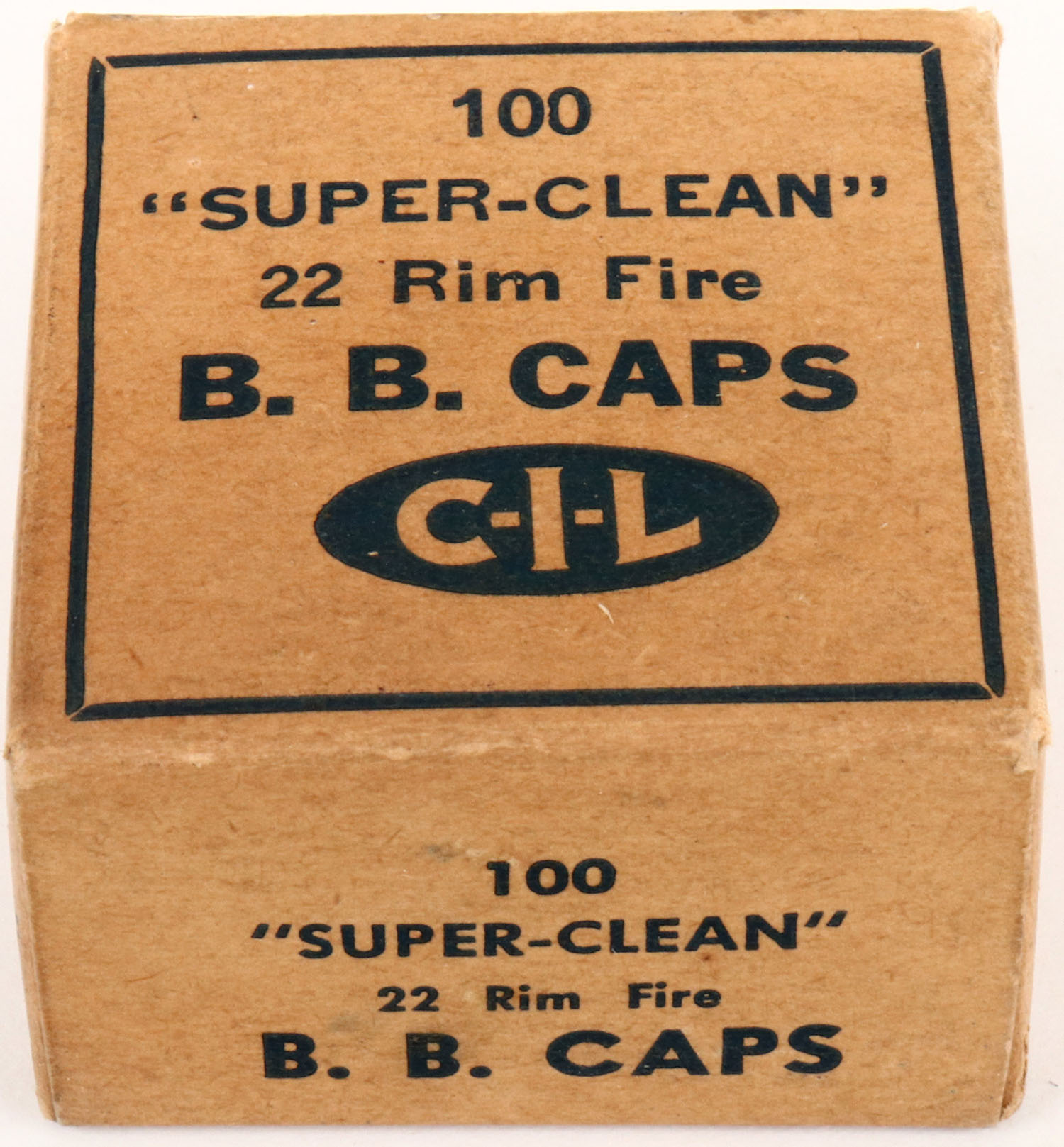C.I.L., Super-Clean, B.B. Caps, RHWeb: CIL-3 BB-1, Full, 1pc. Buff box, box is solid with minty color, very minor corner wear, edges are crisp, top flap is solid, ammo is excellent. Grade: Excellent ++ - Value: 10 to 50