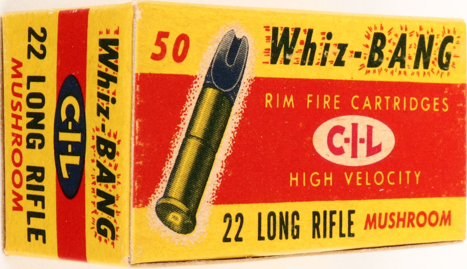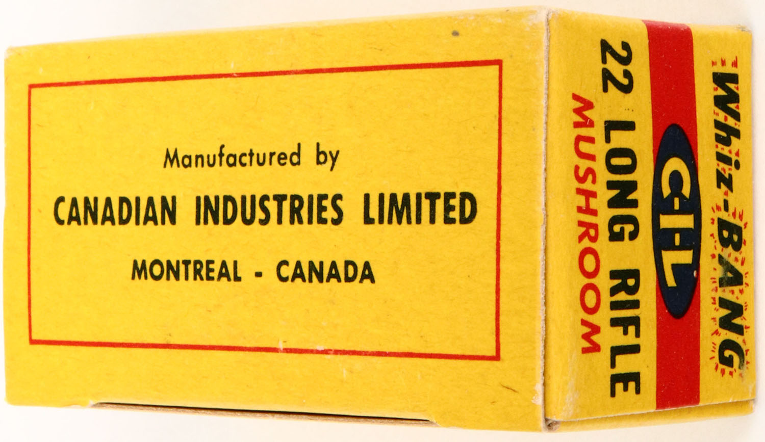 C.I.L., Whiz-Bang Mushroom, .22 Long Rifle, RHWeb: CIL-3 LR-2f, Full, 1pc. Yellow & red box, box is mint with minty color, corners are sharp, edges are crisp, top flap is rigid, ammo is excellent to minty. Grade: Mint - Value: 20 to 80