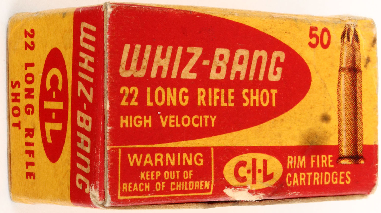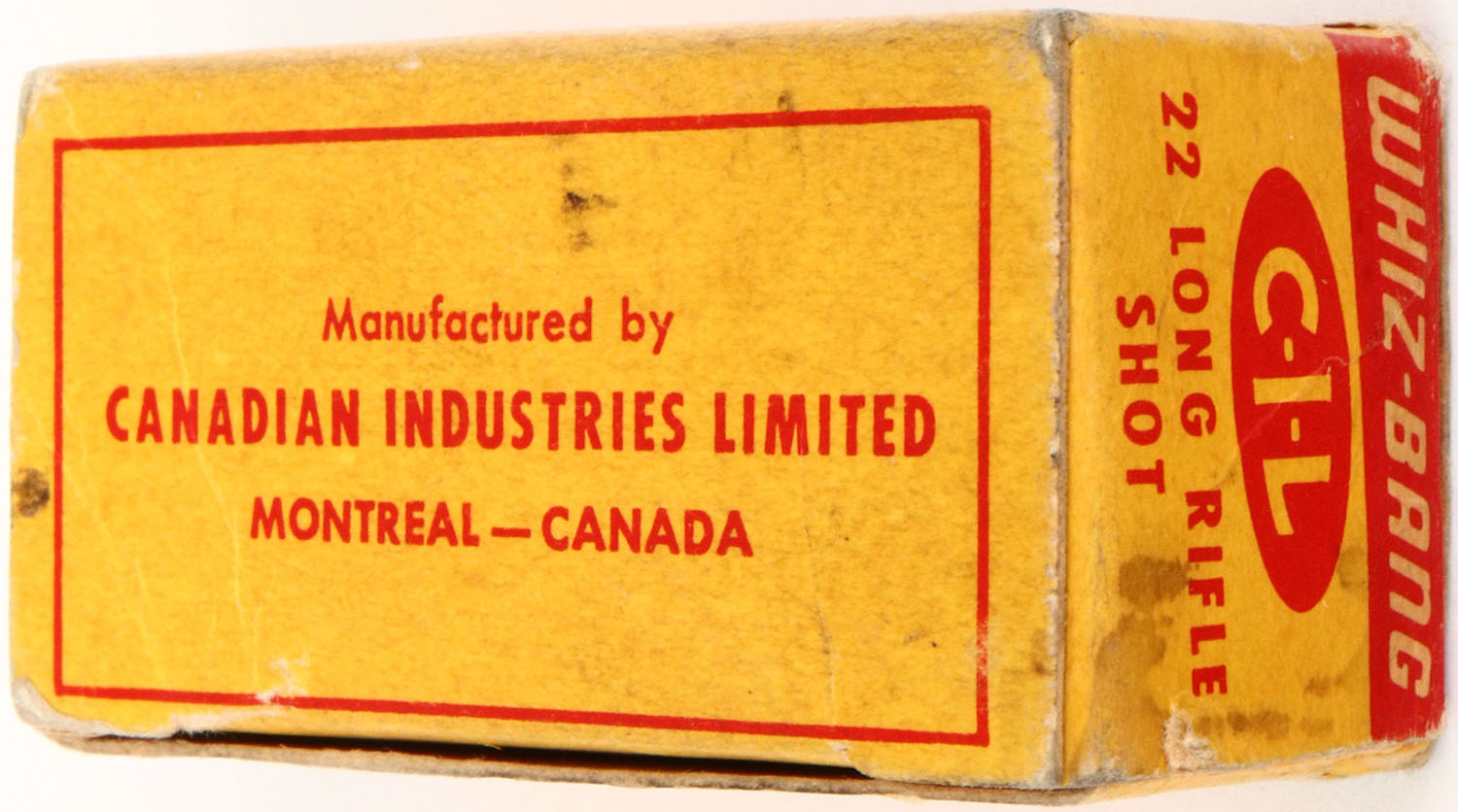C.I.L., Whiz-Bang, .22 Long Rifle Shot, High Velocity, RHWeb: CIL-6 LR-4, Full, 1pc. Yellow & red box, box is solid with excellent color, very minor age soiling, minor corner & edge wear, top flap is rigid, ammo is excellent. Grade: Excellent ++ - Value: 20 to 60