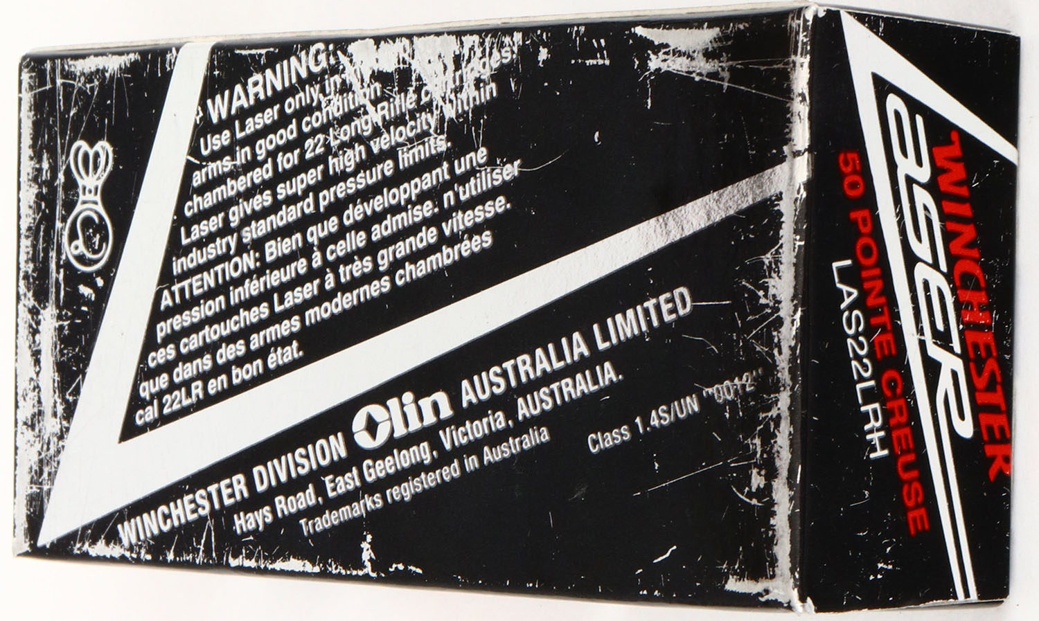 Winchester (Australia), Laser, .22 Long Rifle Hollow Point, RHWeb: (Australia) LASER-1 LR-4a, Full, 1pc. Black silver & red box, box is solid with minty color, very minor shelf wear, corners are sharp, edges are crisp, end flaps are solid, ammo is excellent to minty. Grade: Excellent ++ - Value: 6 to 30