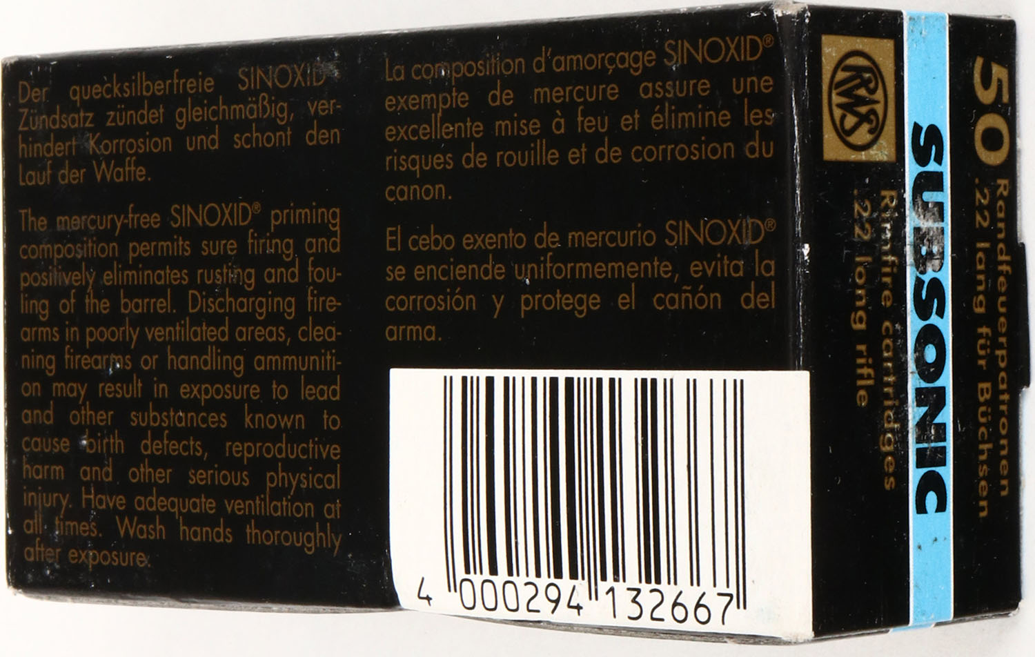 RWS, Dynamit Nobel, .22 Long Rifle Subsonic, RHWeb: (Germany) RWS-9 LR-6, Full, 1pc. Black & blue box, box is near mint with minty color, only very minor shelf wear, corners are sharp, edges are crisp, end flaps are solid, ammo is minty. Grade: MINT - Value: 8 to 40