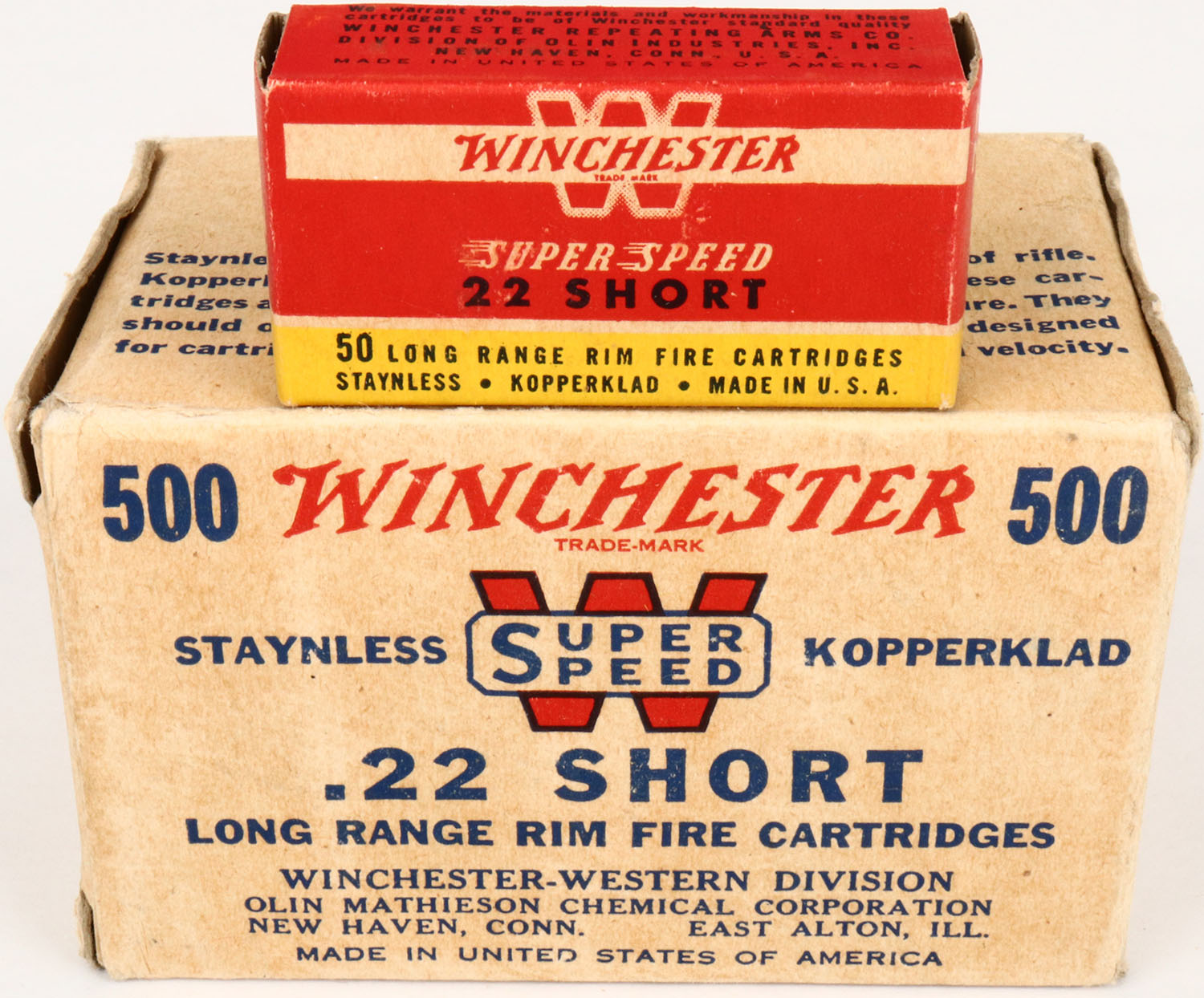 Winchester, .22 Short, Staynless Kopperklad, Full, 500rds. 1pc. Buff brick with blue & red printing, brick is solid with excellent color, minor edge & corner wear, top & left end have been written on, inside boxes are excellent. Grade: Excellent - Value: 50 to 150