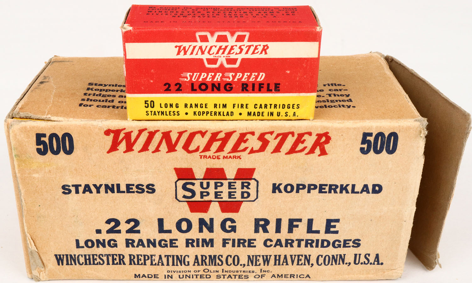 Winchester, .22 Long Rifle, Staynless Kopperklad, Full, 500rds. 1pc. Buff brick with blue & red printing, right end flap is torn, has excellent color, minor edge & corner wear, very minor shelf wear, inside boxes are excellent to minty. Grade: Very Good ++ - Value: 40 to 120