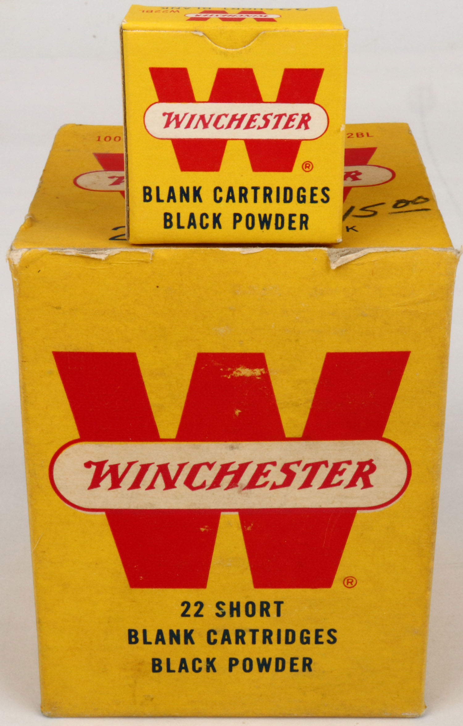 Winchester, .22 Short Blank Cartridges, Black Powder, Extra Loud, Full, 1000rds., 1pc. Yellow red & white box, box is solid with excellent color, top has been written on, minor corner & edge wear, top & bottom flaps are rigid, inside boxes are excellent. Grade: Excellent + - Value: 20 to 100