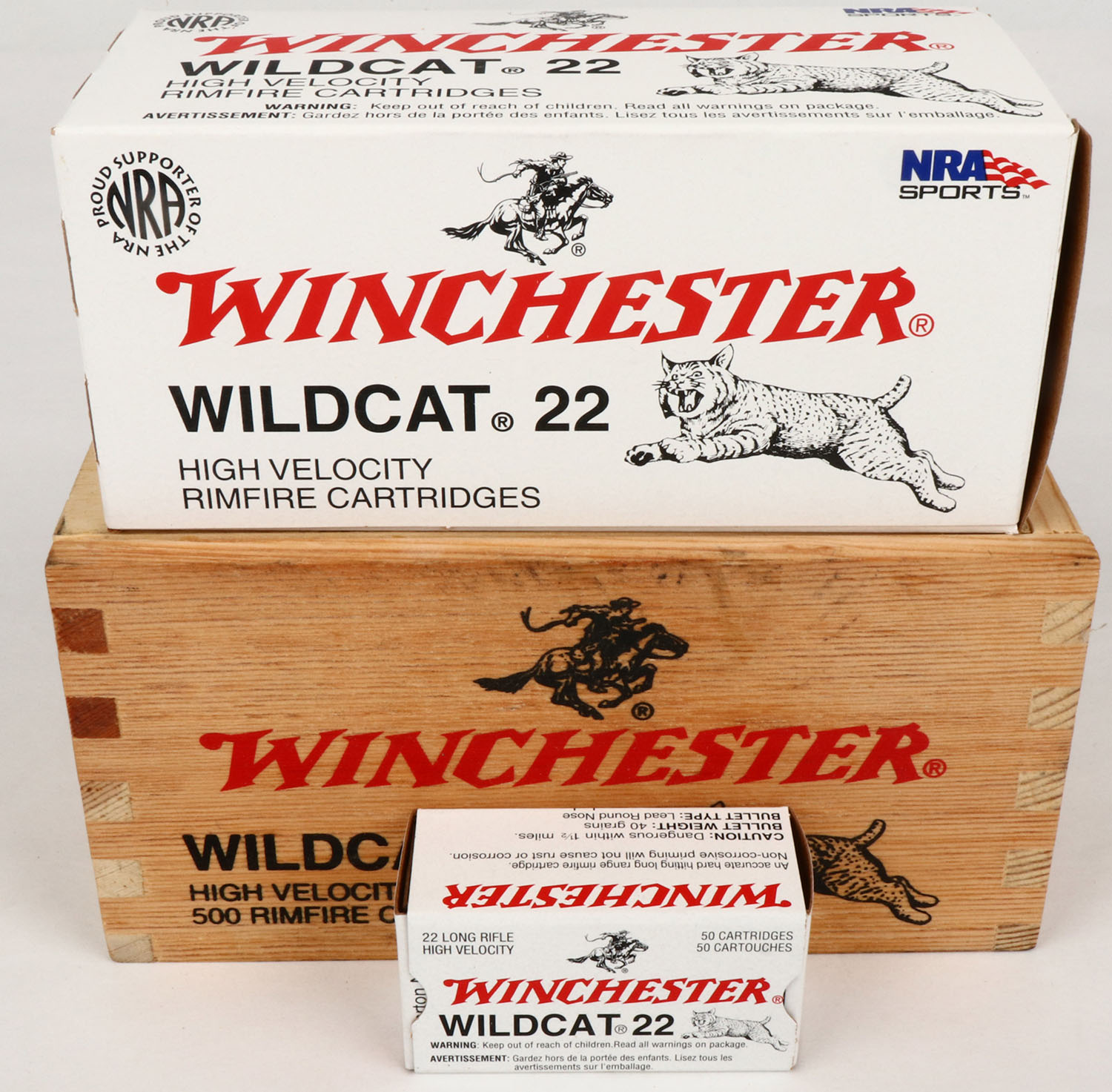 Winchester, Wildcat, .22 Long Rifle, High Velocity, Cabela's Wood Box, Full & Sealed, 500rds. Wood box is solid with excellent color, some shelf wear, sealing tape has partially peeled. Grade: Mint - Value: 50 to 150