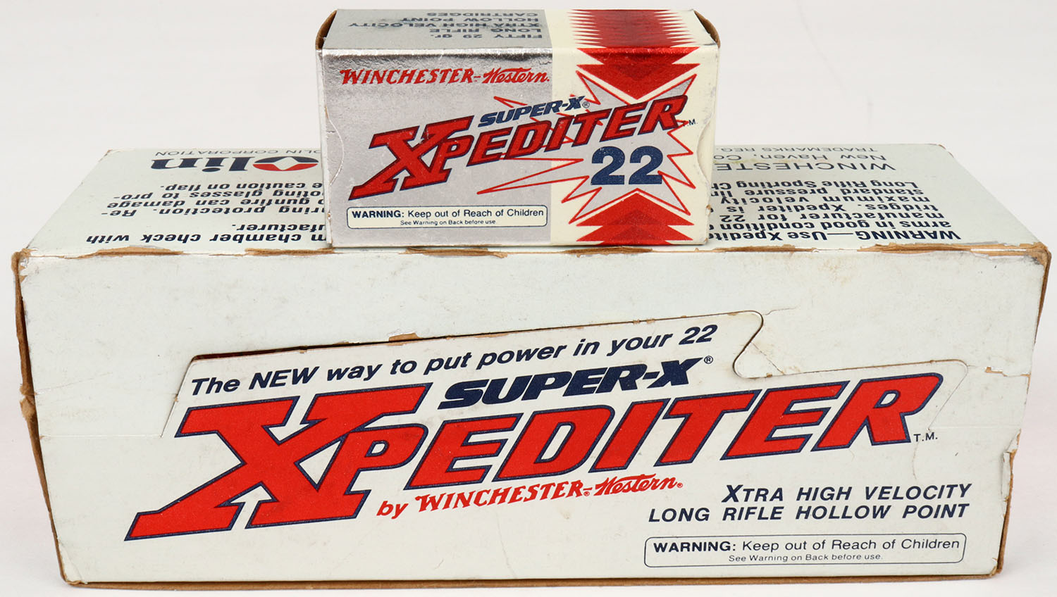 Winchester-Western, Xpediter, .22 Long Rifle Hollow Point, Xtra High Velocity, Full, 500rds. Silver white & red brick, brick is solid with excellent color, edge & corner wear, top flap is solid, inside boxes are excellent. Grade: Excellent + - Value: 50 to 150
