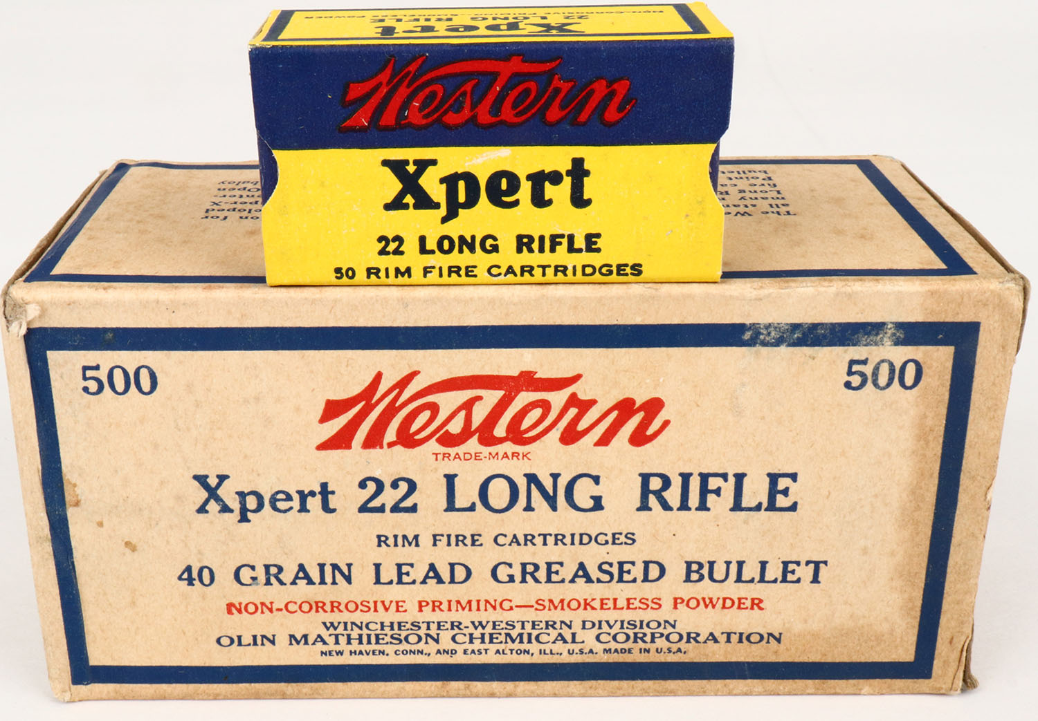 Western, Xpert, .22 Long Rifle, Lead Greased Bullet, Full, 500rds. 1pc. Buff blue & red brick, brick is solid with excellent color, very minor age soiling & corner wear, edges are mostly crisp, end flaps are rigid, inside boxes are minty. Grade: Excellent + - Value: 50 to 150