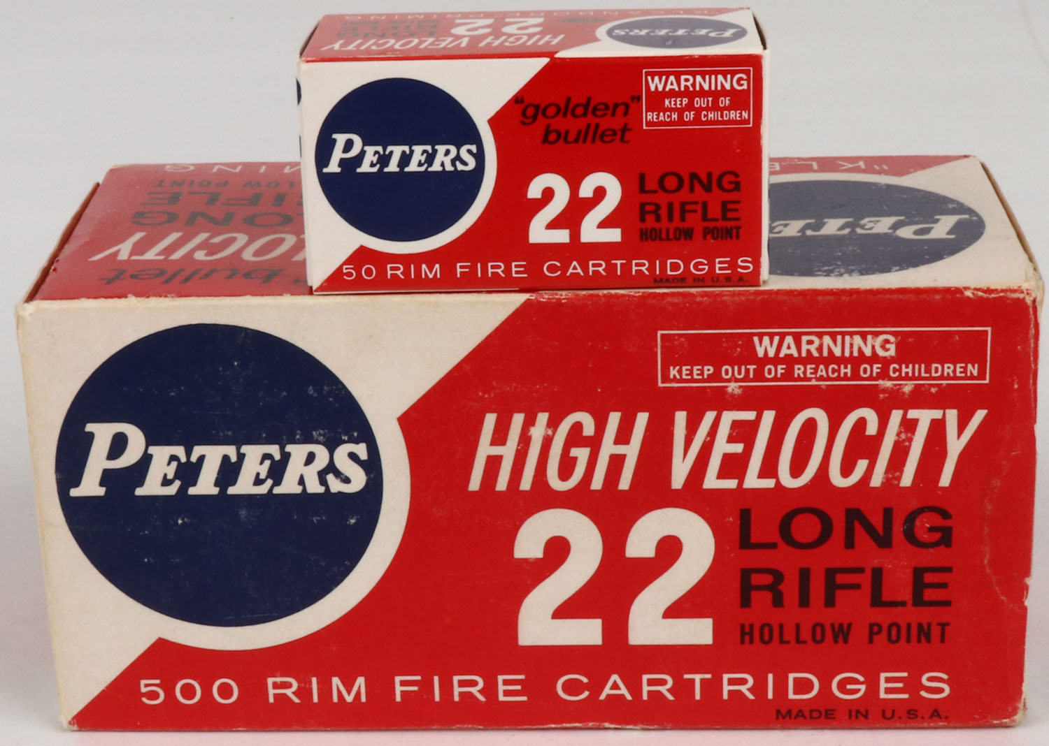 Peters, High Velocity, .22 Long Rifle Hollow Point, ''golden'' bullet, Full, 500rds. 1pc. Red white & blue brick, brick is solid with excellent color, very minor corner & edge wear, end flaps are rigid, inside boxes are minty. Grade: Excellent + - Value: 40 to 120
