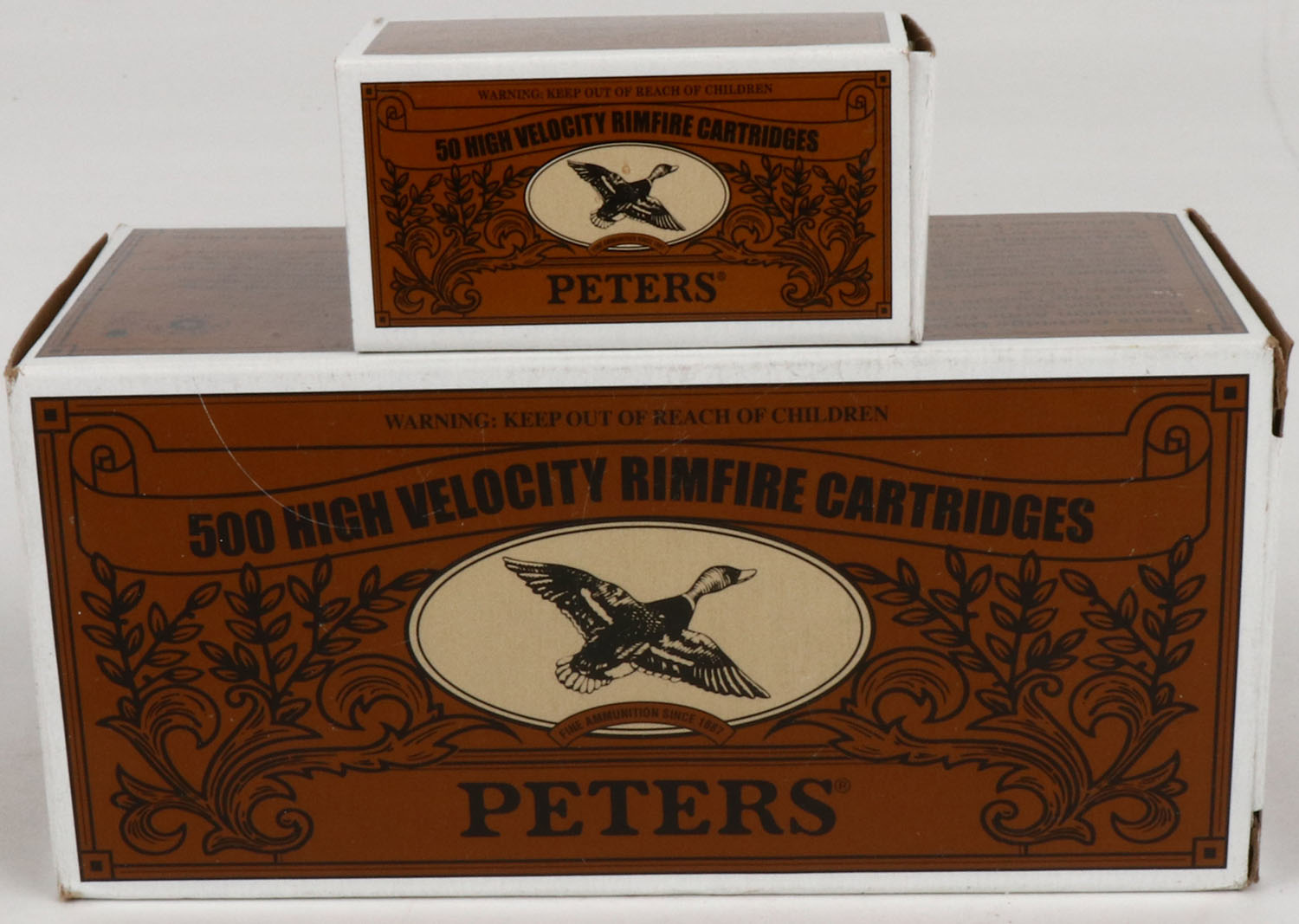 Peters, .22 Long Rifle, High Velocity Solid Point, Full, 500rds. Brown black & cream brick, brick is solid with minty color, very minor corner wear, inside boxes are minty. Grade: Excellent ++ - Value: 50 to 150