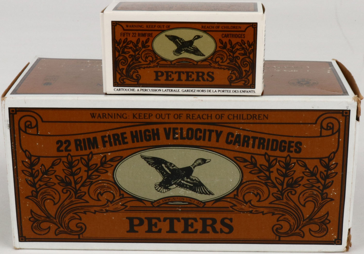 Peters, .22 Long Rifle, High Velocity Solid Point, Full, 500rds. Brown black & green brick, brick is solid with excellent color, very minor corner wear, very minor scuffing to all sides, inside boxes are mint. Grade: Excellent ++ - Value: 50 to 150