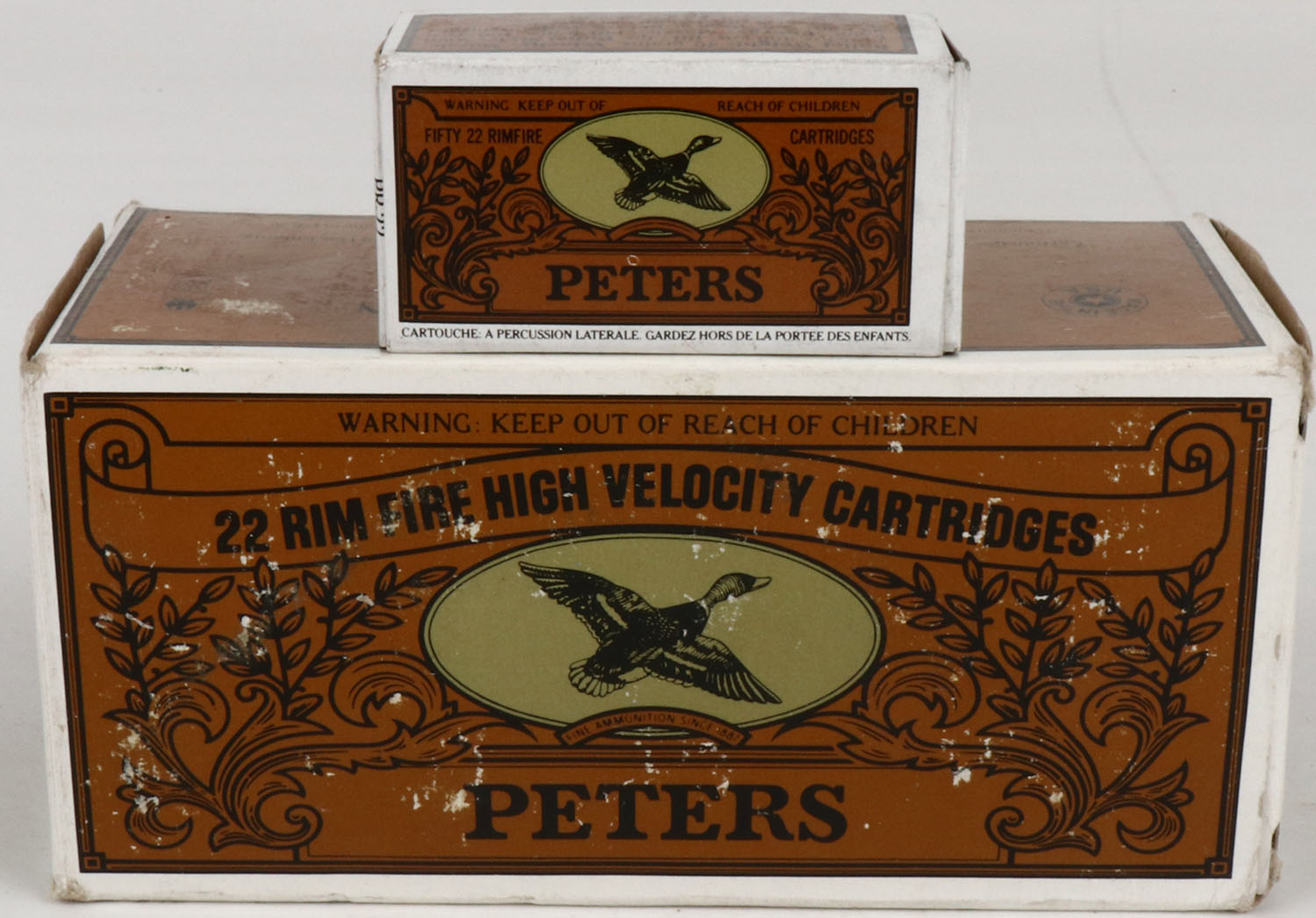 Peters, .22 Long Rifle, High Velocity, Full, 500rds. Brown black & green brick, brick is solid with excellent color, minor shelf & corner wear, edges are mostly crisp, end flaps are solid, inside boxes are excellent to minty. Grade: Excellent ++ - Value: 50 to 150