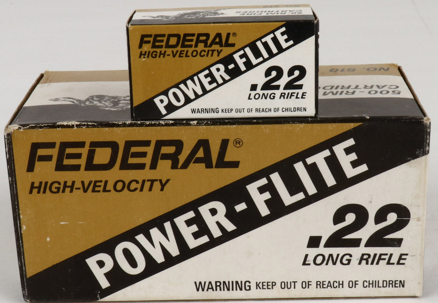 Federal, Power-Flite, .22 Long Rifle, Full, 500rds. 1pc. Black white & gold brick, brick is solid with excellent color, only very minor shelf & corner wear, edges are crisp, end flaps are rigid, inside boxes are minty. Grade: Excellent ++ - Value: 20 to 100