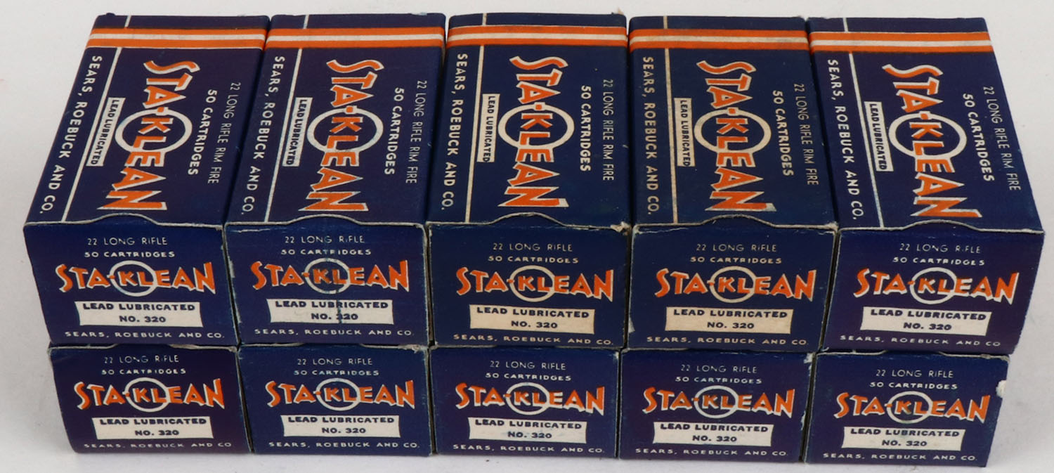 Sears, Sta-Klean, .22 Long Rifle, Lead Lubricated, RHWeb: SEARS-5 LR-1b, lot of (10) Blue orange & white boxes, boxes are minty with minty color, sharp corners, crisp edges, No brick sleeve. Grade: Excellent ++ - Value: 50 to 150