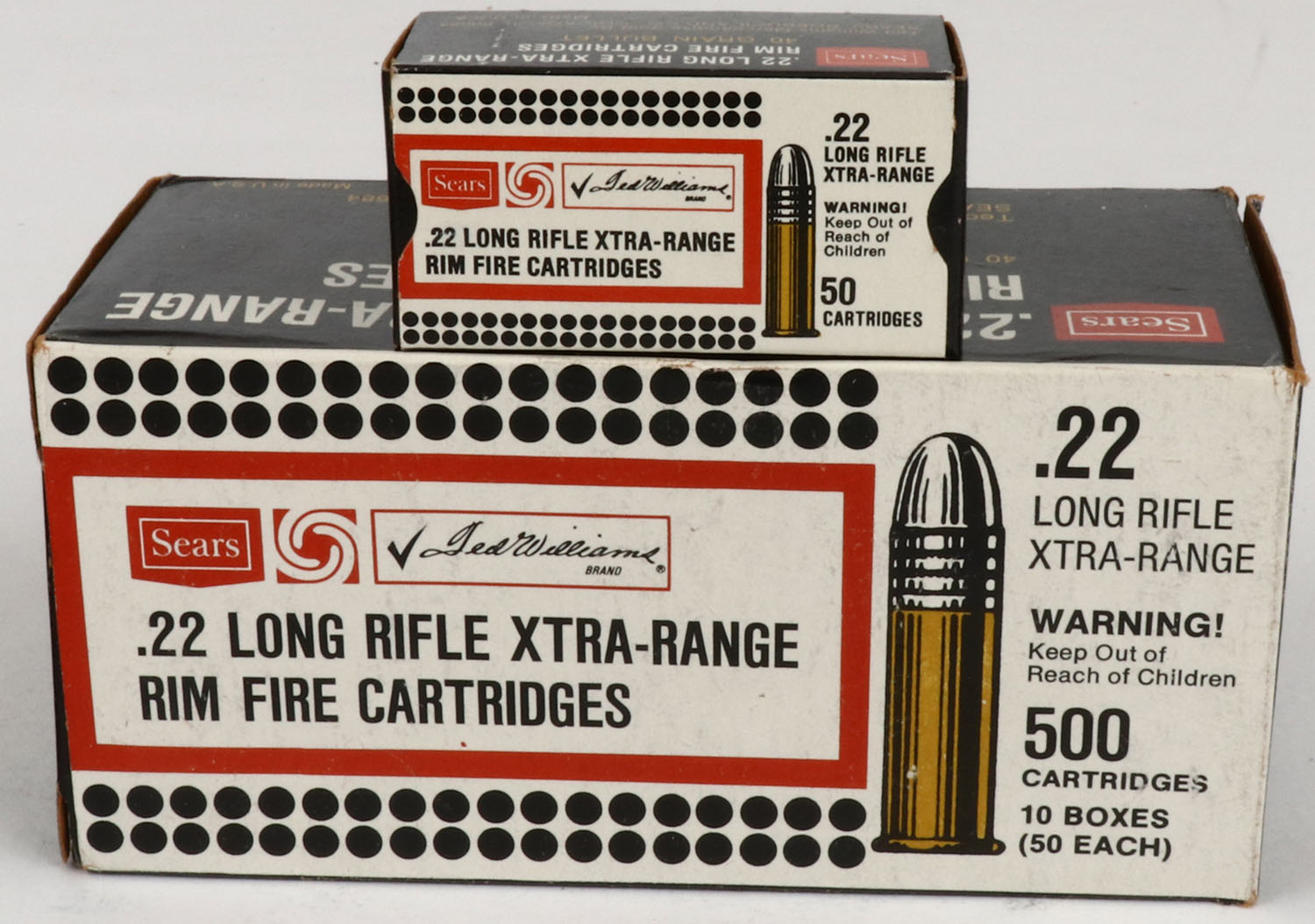 Sears, .22 Long Rifle, Xtra-Range, Full, 500rds. 1pc. Black white & red brick, brick is solid with excellent color, very minor shelf & corner wear, edges are mostly crisp, end flaps are solid, inside boxes are excellent to minty. Grade: Excellent ++ - Value: 40 to 120