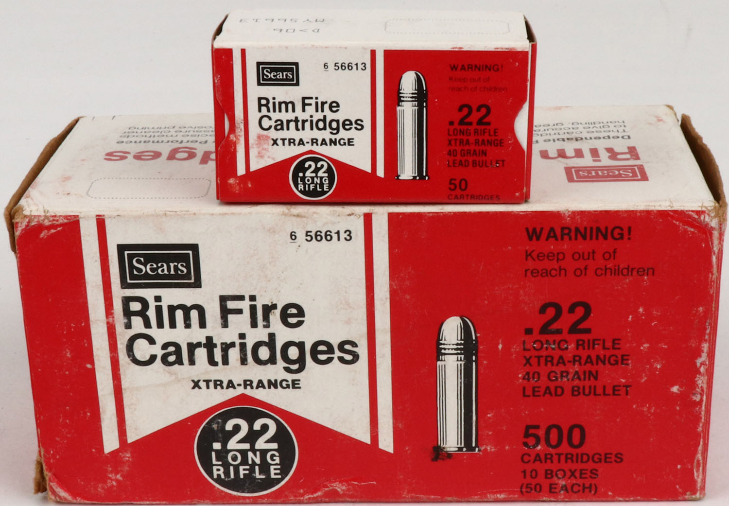 Sears, Xtra-Range, .22 Long Rifle, Partial 9 Boxes, 1pc. Red white & black brick, brick is solid with very good to excellent color, minor age soiling, some corner wear, end flaps are rigid, inside boxes are minty. Grade: Excellent + - Value: 100 to 300