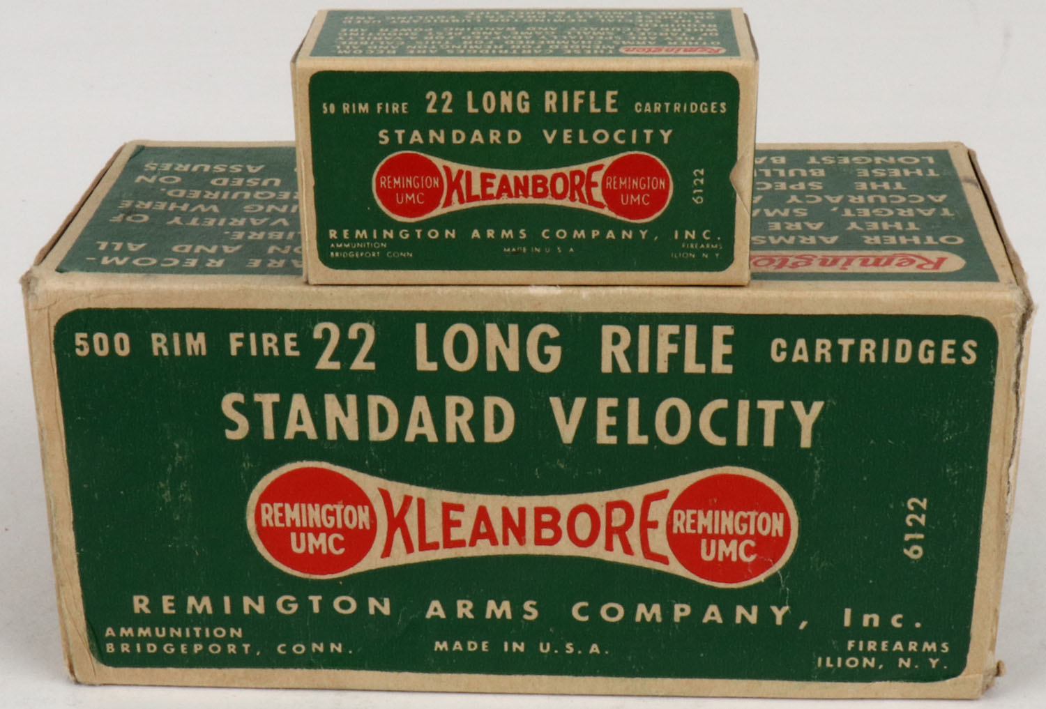 Remington, Kleanbore, .22 Long Rifle, Standard Velocity, Full, 500rds. 1pc. Green white & red dogbone brick, brick is solid with excellent color, very minor shelf & corner wear, edges are crisp, end flaps are fairly rigid, inside boxes are minty. Grade: Excellent ++ - Value: 50 to 150