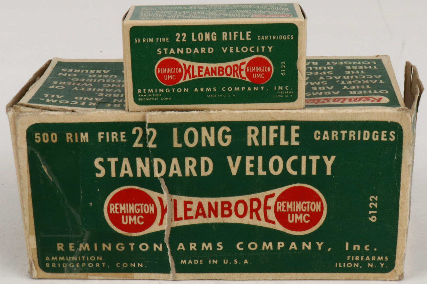 Remington, Kleanbore, .22 Long Rifle, Standard Velocity, 6122, Partial 5 boxes, 1pc. Green white & red dogbone brick, brick has excellent color, taped in several places, large tear on top, right end flap is torn, edge & corner wear, inside boxes are minty. Grade: Very Good - Value: 10 to 60