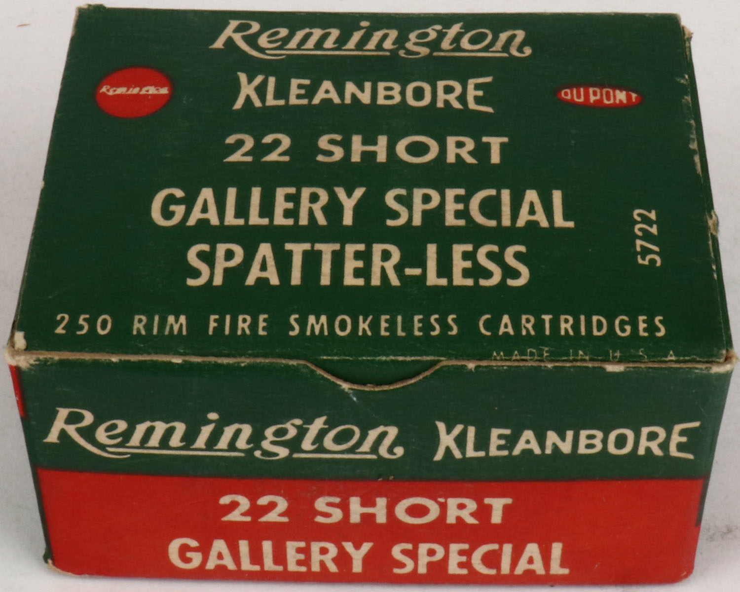Remington, Kleanbore, .22 Short, Gallery Special, Spatter-Less, 5722, Full, 1pc. Green red & white bulk box, box is solid with excellent color, very minor edge & corner wear, top flap is solid, ammo is excellent to minty. Grade: Excellent ++ - Value: 40 to 120