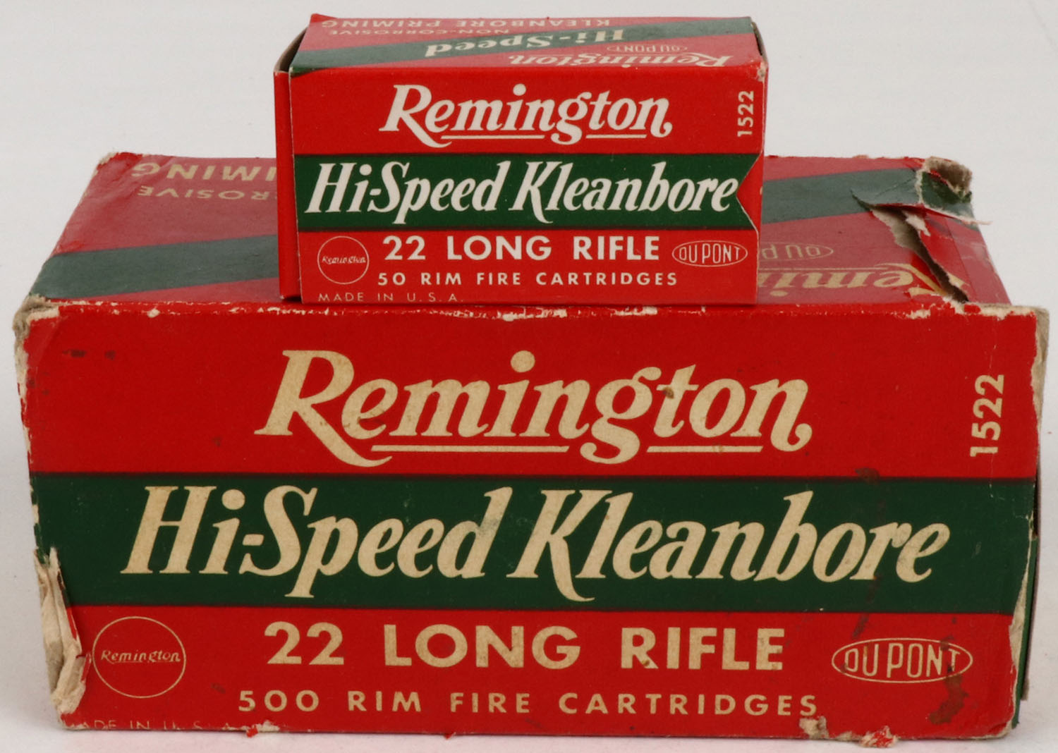 Remington, Hi-Speed Kleanbore, .22 Long Rifle, 1522, Full, 500rds. 1pc. Red white & green brick, brick has excellent color, both end flaps are missing, edge & corner wear, inside boxes are minty. Grade: Very Good ++ - Value: 50 to 150