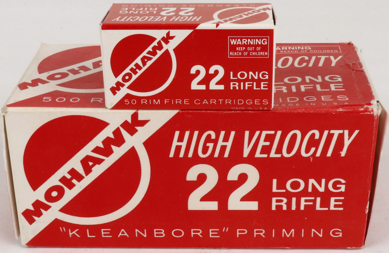 Remington, Mohawk, .22 Long Rifle, High Velocity, Full, 500rds. 1pc. Red & white brick, brick is solid with excellent color, some edge & corner wear, end flaps are solid, inside boxes are mint. Grade: Excellent + - Value: 50 to 150