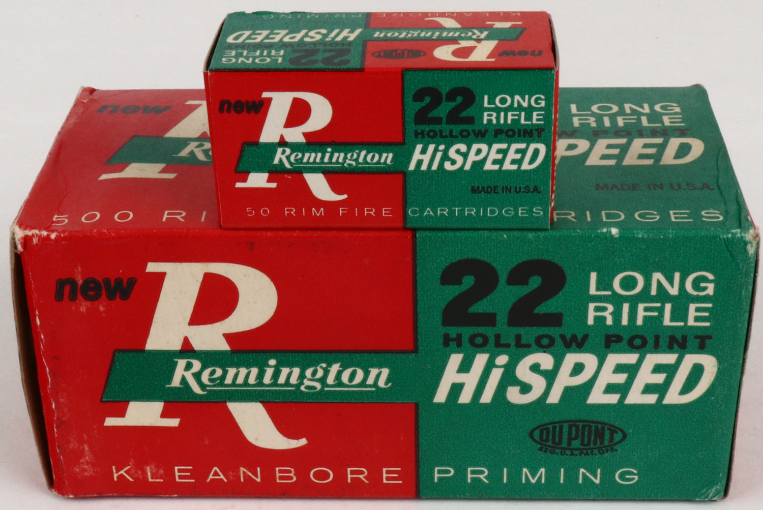 Remington, Hi-Speed, .22 Long Rifle Hollow Point, Partial 8 boxes, 1pc. Red green & white brick, brick is solid with excellent color, very minor age soiling, very minor shelf & corner wear, edges are crisp, end flaps are solid, inside boxes are mint. Grade: Excellent ++ - Value: 30 to 120