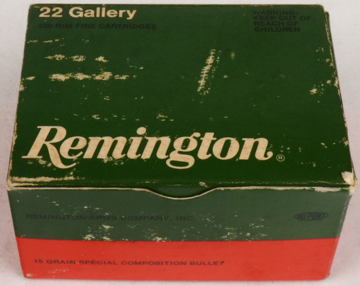 Remington, Spatter-Less, .22 Short Gallery, 15 Grain Special Composition Bullet, RHWeb: REM-19 S-6, 1pc. Full, 250rds. Green red & white bulk box, box is solid with excellent to minty color, very minor shelf wear, corners are mostly sharp, edges are crisp, top flap is rigid, ammo is excellent. Grade: Excellent ++ - Value: 20 to 80