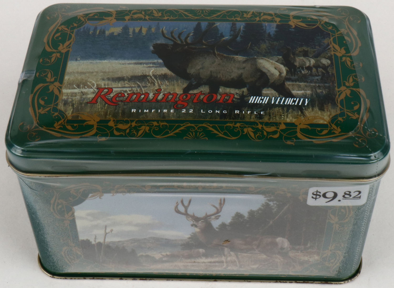 Remington, Limited Edition Collectors Tin, .22 Long Rifle, High Velocity, 1pc. Full & Sealed, 400rds. Hinged tin features bull elk bugling in a meadow. Grade: MINT - Value: 40 to 120
