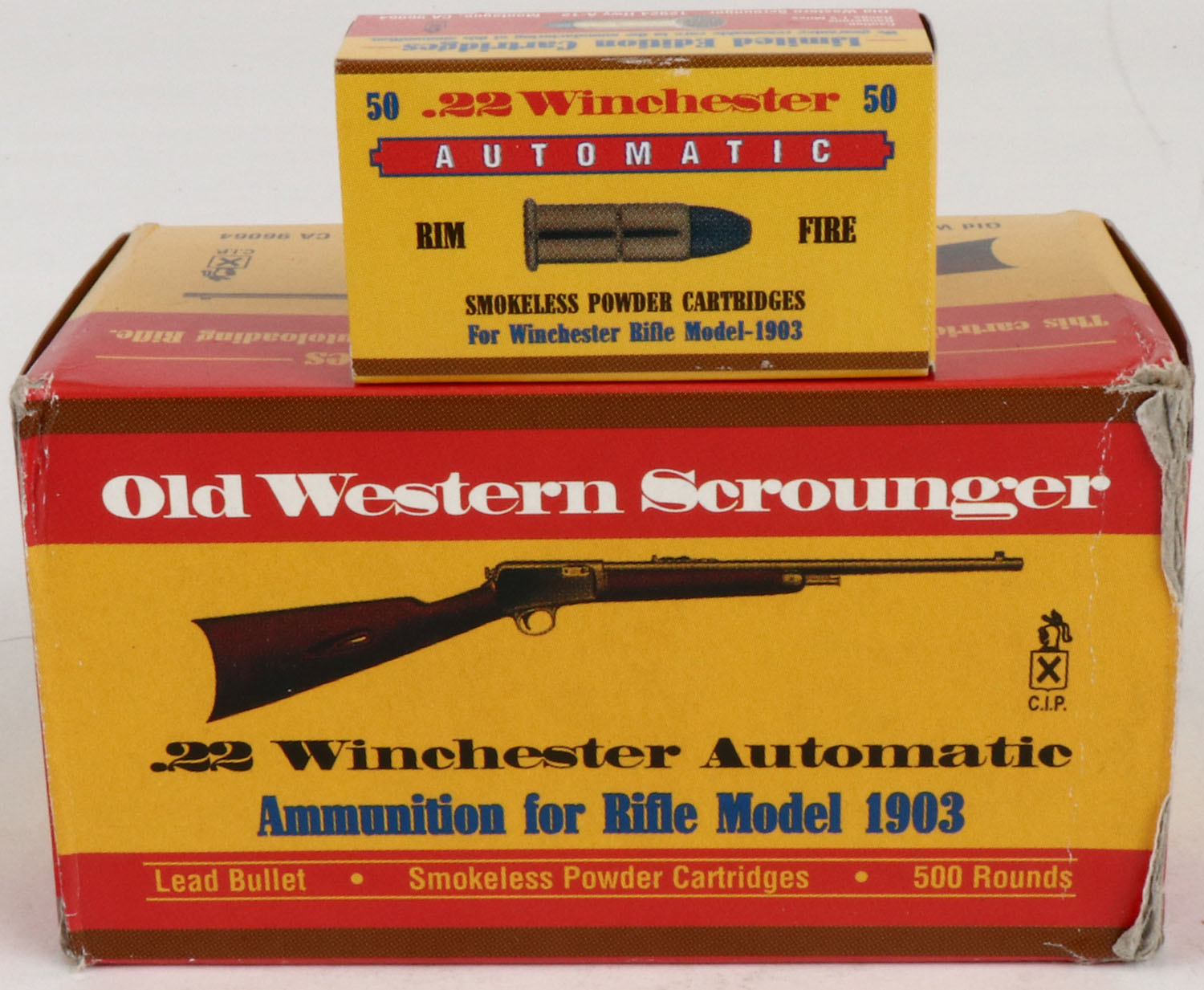 Old Western Scrounger, .22 Winchester Automatic, Smokeless Powder, Full, 500rds. 1pc. Yellow & red brick, brick is solid with minty color, some corner & edge wear, end flaps are solid, inside boxes are minty. Grade: Excellent + - Value: 200 to 400