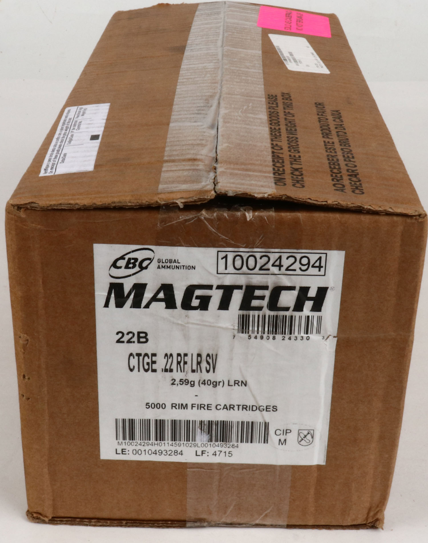 Magtech, .22 Long Rifle, Standard Velocity, FULL & SEALED, 5000rds. Case, case is solid with excellent color, corner & edge wear, box is somewhat dirty. Grade: Excellent ++ - Value: 400 to 800