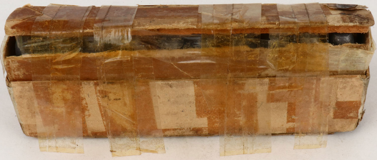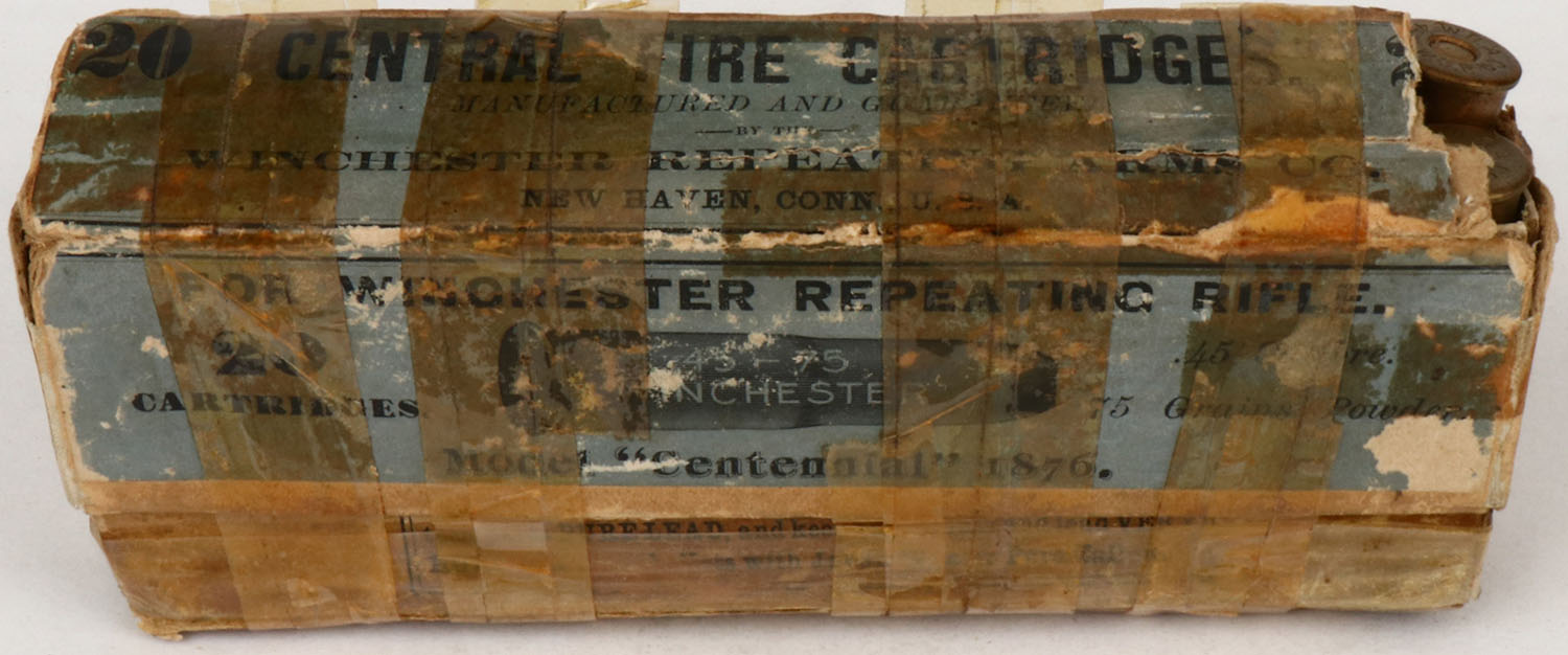 Winchester, .45-75 Winchester Model Centennial 1876, Full 2pc., buff box with blue label & black print, box is covered in tape, has very good color, age soiling, edge & corner wear, 3 seam splits to top, 3 seam splits to bottom, right end of lid is torn, ammo is excellent. Grade: Good ++ - Value: 100 to 400