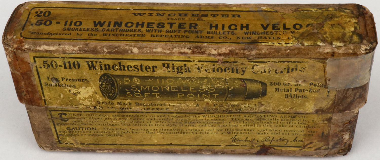 Winchester, .50-110 Winchester High Velocity, Smokeless Soft Point, Partial 6rds., 2pc. Buff box with yellow labels, box is solid with good to very good color, age soiling, scuffing, edge wear, staining, ammo is excellent. Grade: Very Good + - Value: 20 to 200