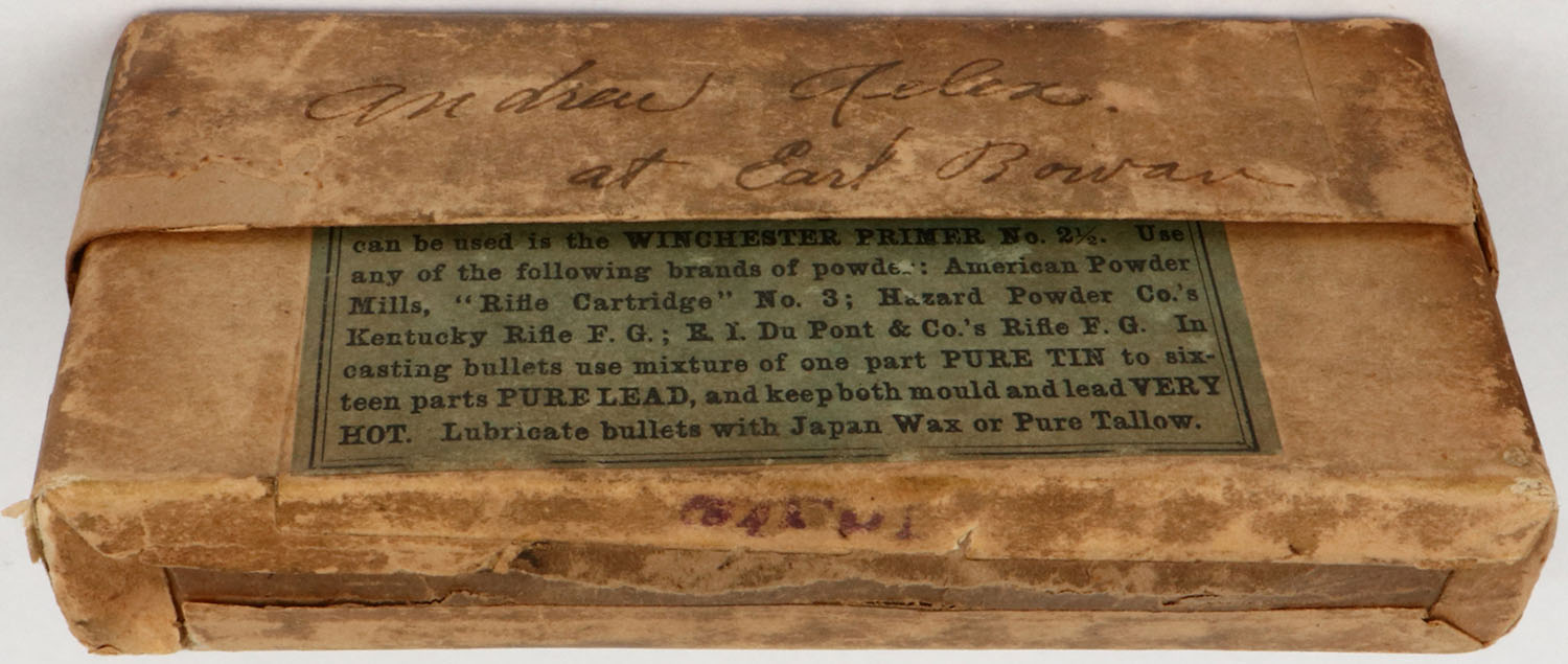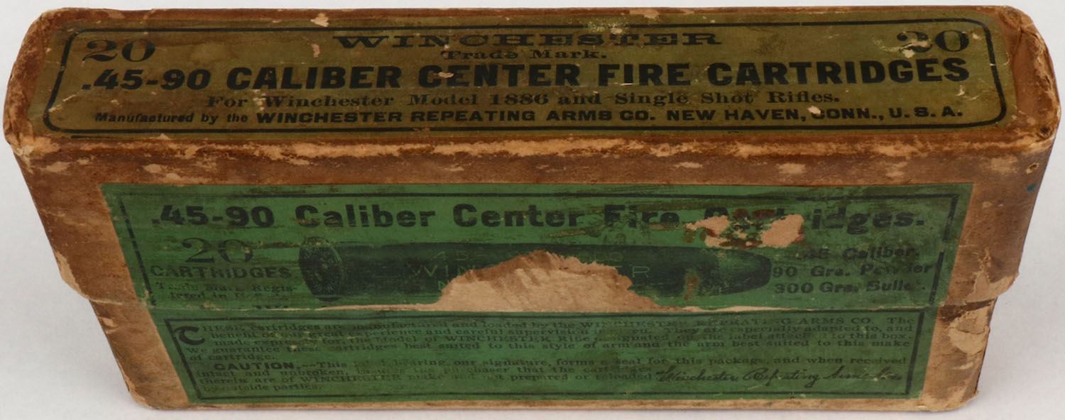 Winchester, .45-90, 300 Grs. Bullet, Partial 19rds. 2pc. Buff box with green labels, box is solid with very good color, age soiling shelf wear, edge & corner wear, tear to label on front, back has been written on, ammo is very good to excellent. Grade: Very Good ++ - Value: 100 to 400