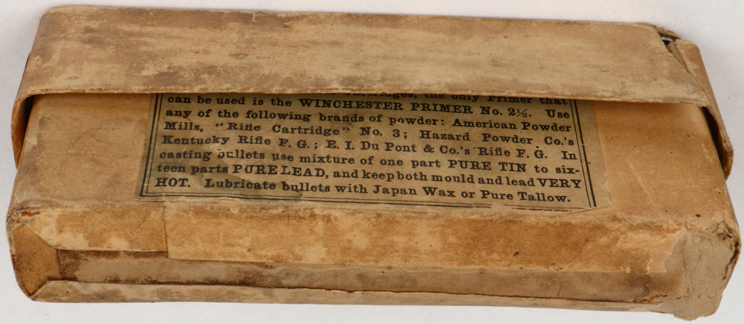 Winchester, .45-70-350 Winchester Model 1886, Full of incorrect ammo, 2pc. Buff box, with green labels, box is solid with good to very good color, age soiling, scuffing, seam split to left corner of lid, edge & corner wear, ammo is excellent. Grade: Very Good + - Value: 10 to 100