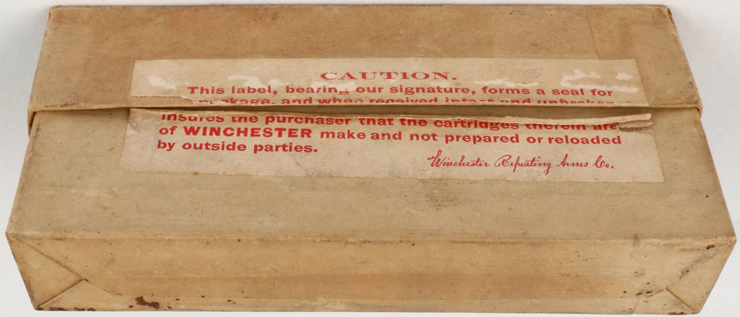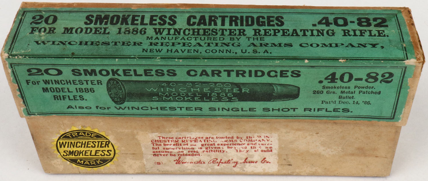 Winchester, .40-82-260, For Winchester Model 1886, Smokeless Powder, Full, 2pc. Buff box with green label, has insert for Winchester New Rival Shot Shells, box is solid with excellent color, partial seam split to top right end, minor edge wear, ammo is excellent. (1554) Grade: Excellent + - Value: 100 to 250