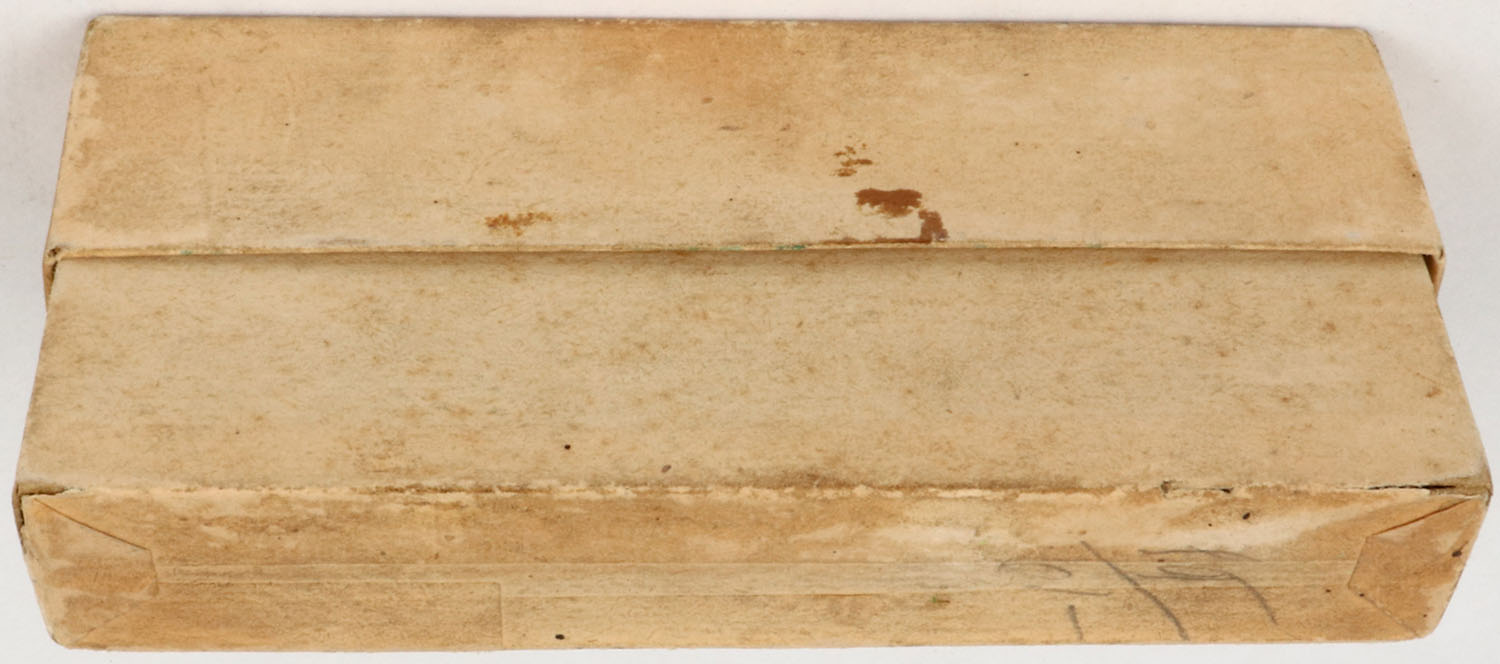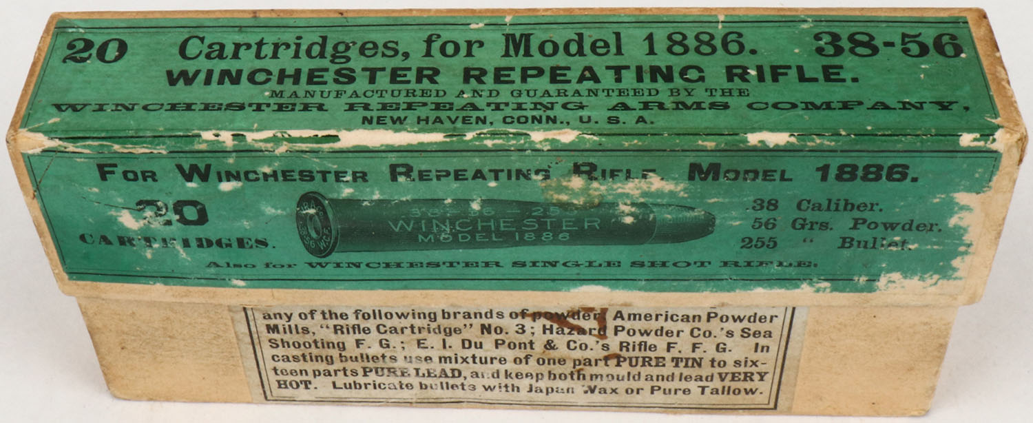 Winchester, .38-56-255, For Winchester Repeating Rifle Model 1886, Full, 2pc. Buff box with green label, box is solid with excellent color, some scuffing, edge & corner wear, bottom has been written on, ammo is excellent. Grade: Excellent - Value: 60 to 180