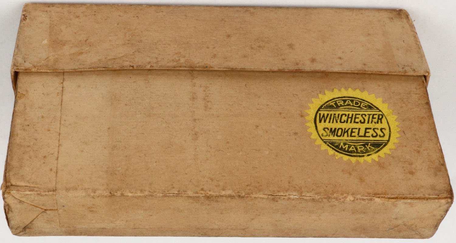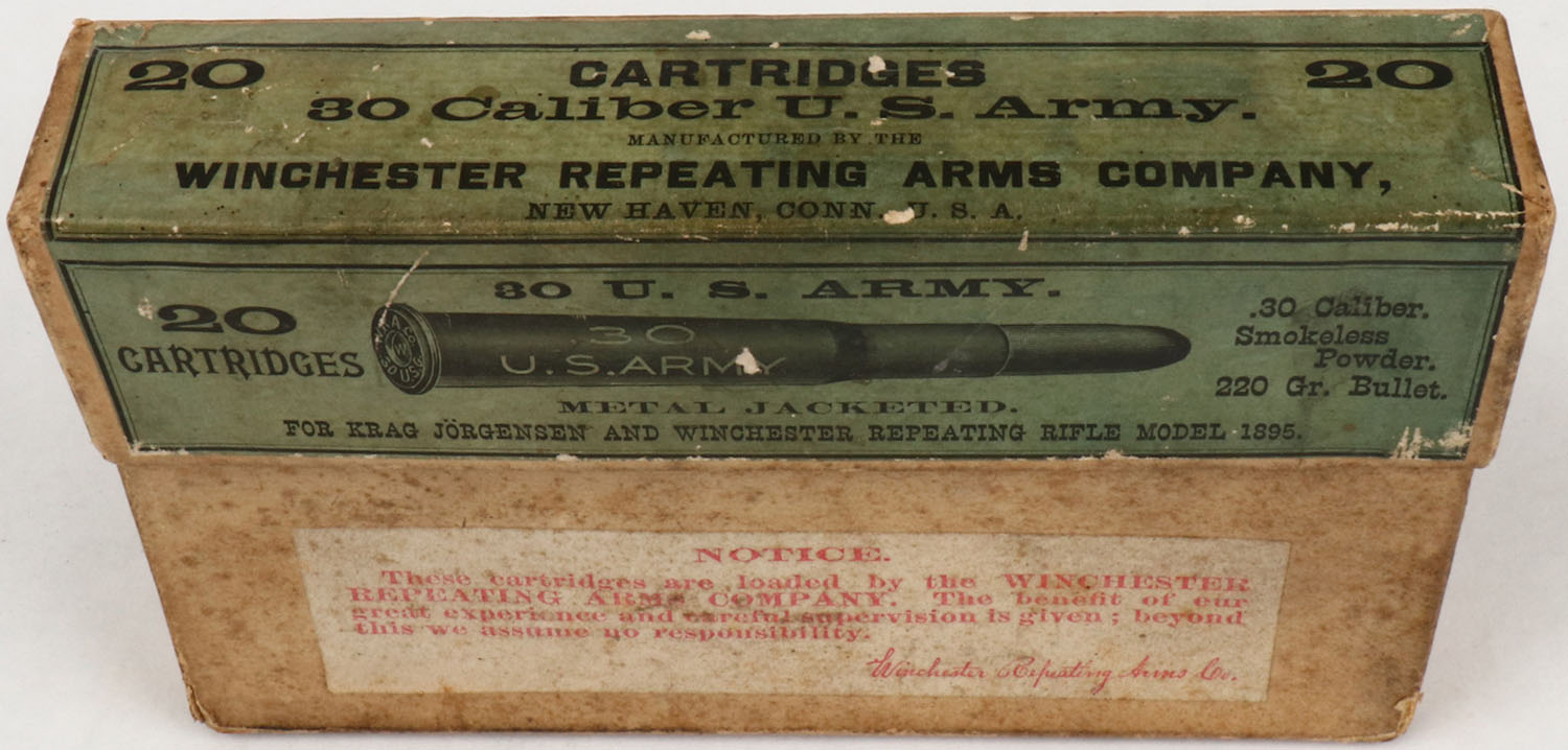 Winchester, .30 Cal U.S. Army, For Krag Jorgensen & Winchester Repeating Rifle Model 1895, 2pc, Full, buff box with green label & black print, box is solid with light age soiling, rub marks & light edge wear, ammo is excellent. Grade: Excellent - Value: 150 to 300
