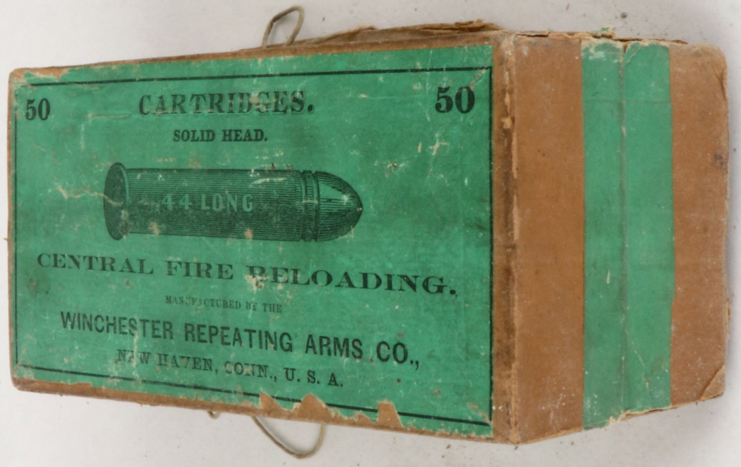 Winchester, 44 Long C.F., Central Fire Reloading, 2pc, Partial, buff box with green label & black print, box is weak with bottom of box dethatched, left end flap of lid had 2 seams split, rub marks & edge wear, ammo is fair with heavy corrosion. Grade: Good ++ - Value: 50 to 250