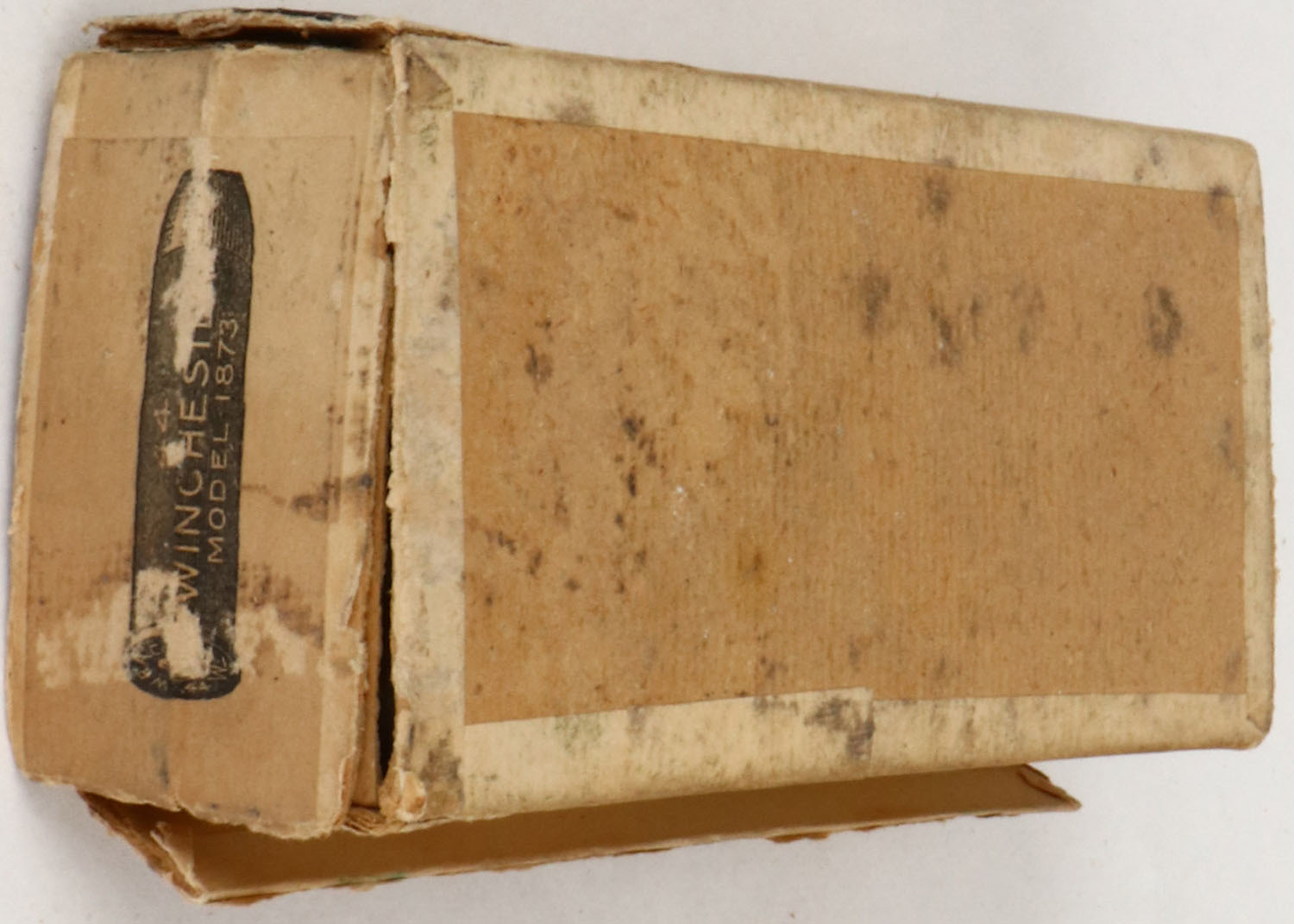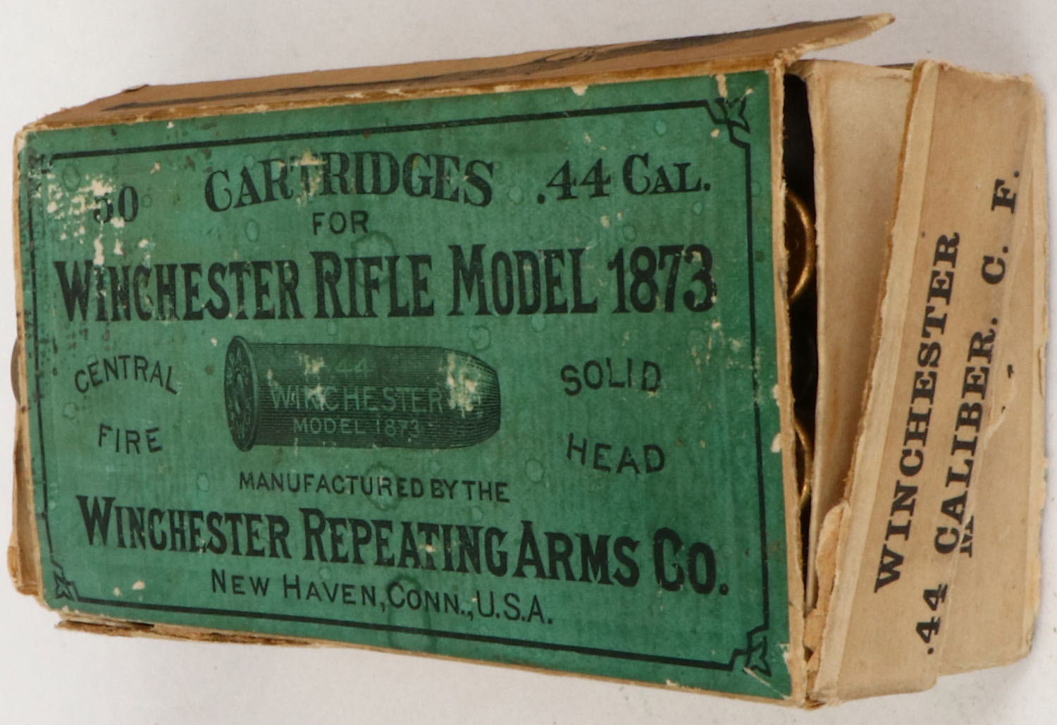Winchester, .44 Cal. Central Fire, For Winchester Rifle Model 1873, Partial 33rds., 2pc. Buff box with green & buff labels, box has excellent color, several seam splits, structural integrity has been compromised, very minor edge & shelf wear, ammo is excellent. Grade: Very Good - Value: 40 to 200