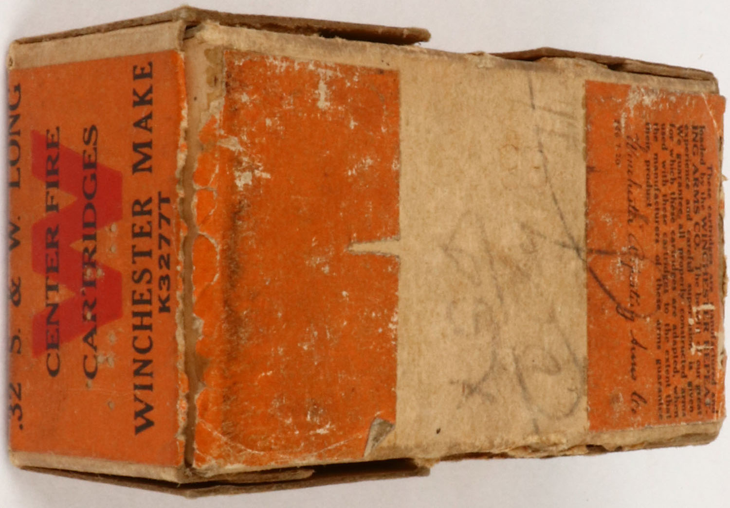 Winchester, .32 Smith & Wesson Long, Center Fire, 98 Grain Lead Bullet, Partial 36rds., 2pc. Buff box with green & orange wraparound label, box is solid with excellent color, some age soiling & edge wear, bottom has been written on, corners are mostly sharp, labels are intact, ammo is excellent. (1333) Grade: Excellent - Value: 20 to 100
